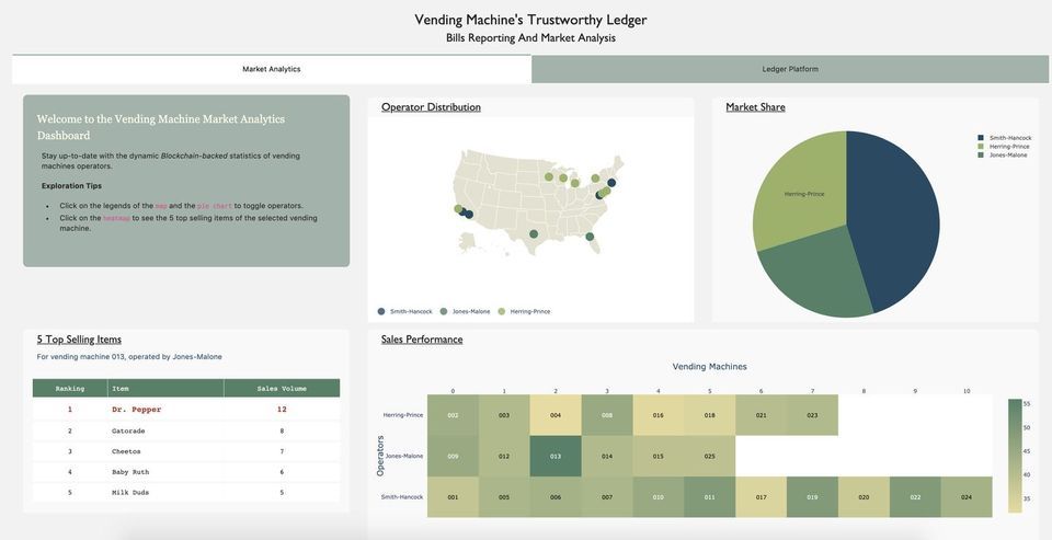 - Client platform. This platform is developed by an existing web application framework, Dash. It has two main functions, one is to view the bill. You can view the ledger of any relevant party, including information of the account, a list of billing information, and total sales turnover and corresponding profit sharing. You can also pick billing information for a certain time period by selecting a date. The second part is a visualization of data. For example, the current market share of all vending machine operators in the vending machine market, their vending machine distribution maps, as well as the sales of each vending machine, and the corresponding best selling items. This information is updated in real time with the data on the chain and can be used for market data analysis.