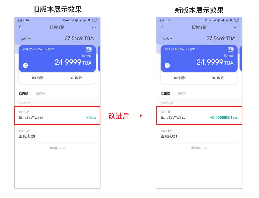 ABT Wallet version 2.3 improves the amount presentation logic to increase display accuracy for amounts less than 1, avoiding situations where the list is shown to 0.