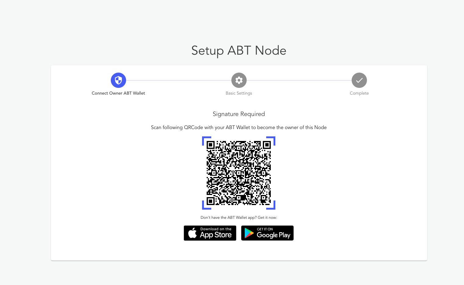 - Use your ABT Wallet to scan the QR Code to begin the set up process. Upon completion you will be taken to the ABT Node dashboard.