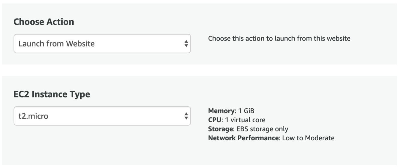 - On the next section, choose “Launch from the Website” from the drop down menu, and then select your preferred EC2 instance size.