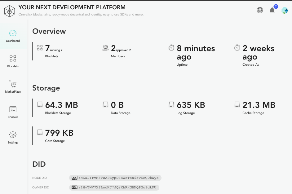 Upon logging in to your ABT Node you will be taken to the main dashboard view. In this view, you can see basic information about your node including storage, your node and owner DID addresses and an overview of running blocklets, team members and more.