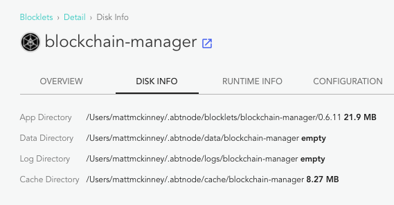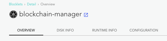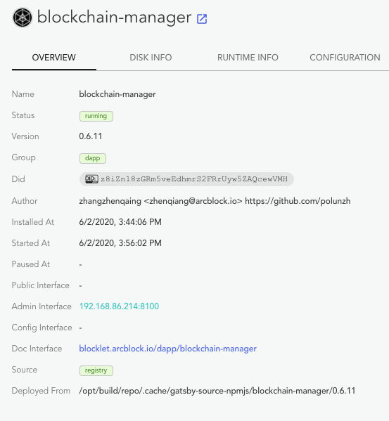 After selecting open you will be taken to the Blockchain Manager overview page. In this area, we can see all the details about our blocklet including details such as name, version, DID address, and more. You will also see some other tabs that allows you to view additional details about your blockchain manager blocklet.