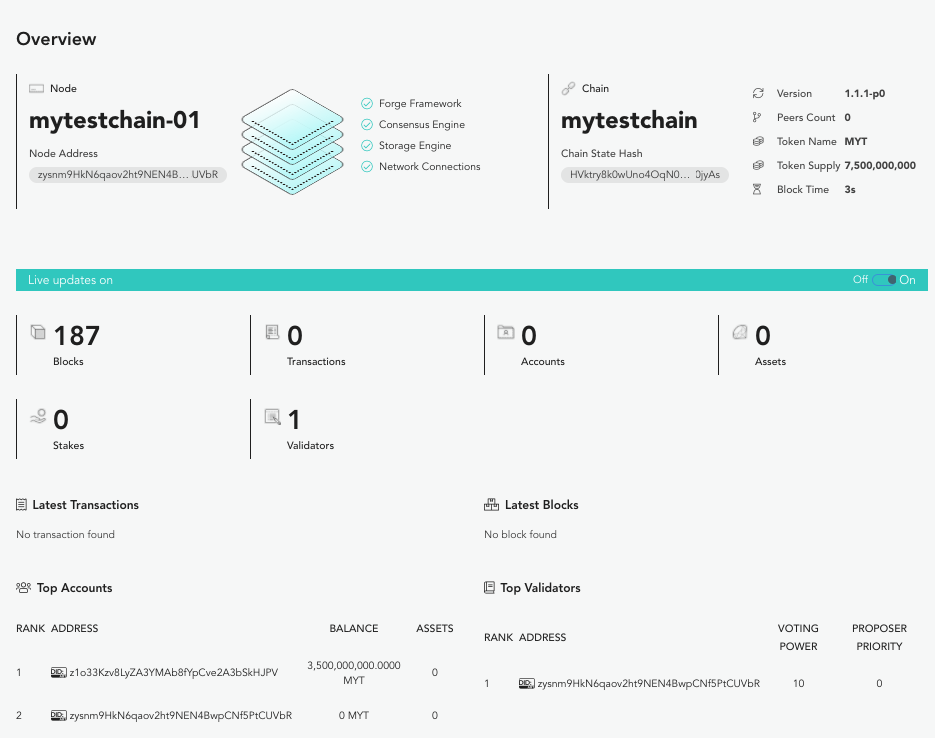 No blockchain would be complete without a blockchain explorer for your new chain. If you select Explorer on the navigation you will see that your new chain gives a powerful, but easy to understand dashboard view of your blockchain.