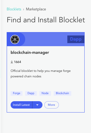 The marketplace is where you can find and install Blocklets. If you remember from our description earlier, Blocklets can be stand-alone apps, reusable components, or smart contracts that allow us to extend the functionality of our ABT Node. For this tutorial, let's find the Blocklet named Blockchain Manager and install it. By default, the latest version of the Blocklet will be installed.