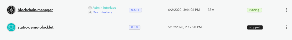 Our new blockchain has been created and deployed successfully. Let's go back to the Blocklets section to see the current status. Select Blocklets on the left-hand action bar and now we can see that our Blockchain Manager blocklet is running and there is now an available Admin Interface and Doc Interface available to us.