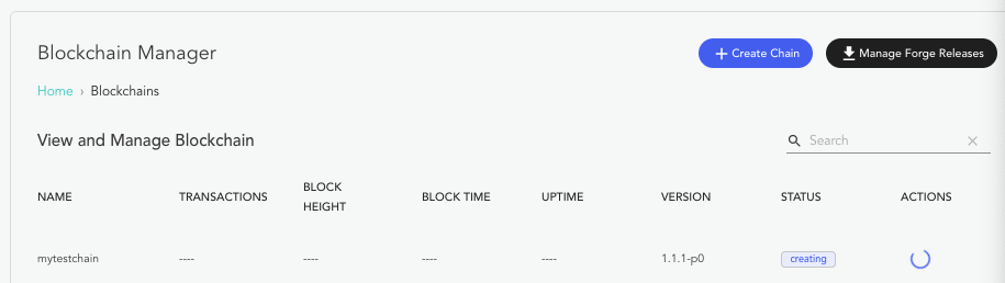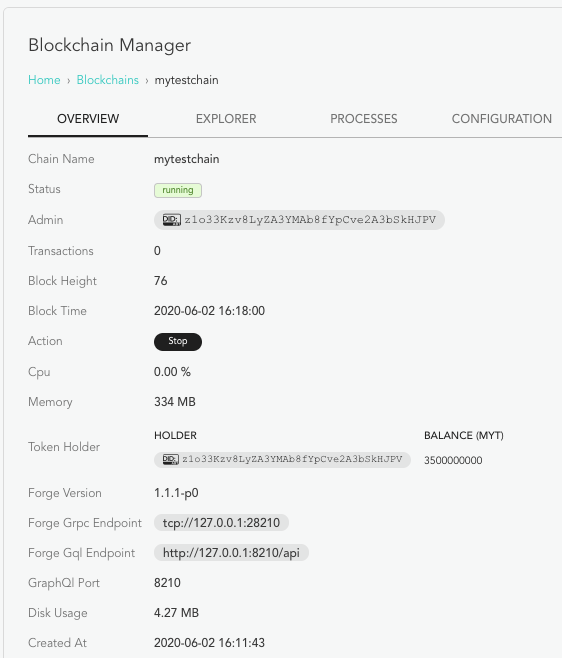 By now, your new blockchain is up and running. On the view and manage blockchain window click on mytestchain on the left-hand side. This will take you to the updated overview area for your blockchain. As you can see now, the blockchain is running and you have new Forge gRRC and Forge GQL Endpoints.