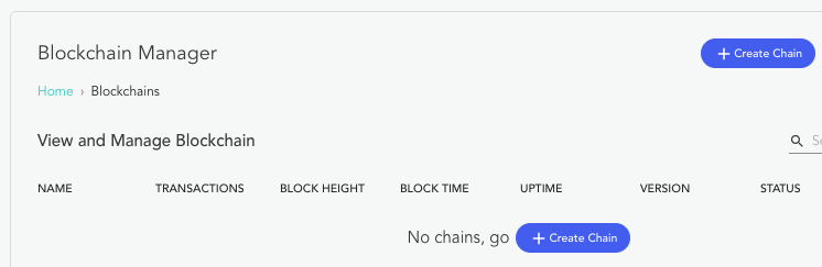 The new Admin Interface takes you to the new Create Chain interface. As a first time visitor, you will see that your blockchain manager currently has No chains. Let's go ahead and select Create Chain.