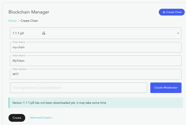 When you select to create a new blockchain you have the choice of creating a new blockchain using a simple version or more advanced version that increases the available customization options you have when creating your chain. For the purposes of this example, we are going to use the simple view and the included defaults such as total tokens available on the blockchain and number of decimal places. Let's begin.