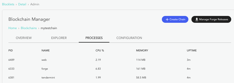 If you select the processes tab you can see some details about your chain including the usage of CPU, Memory and Uptime for your different processes.