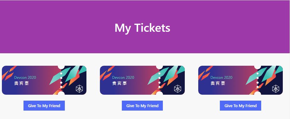 Step 1: Use your device and login to the conference website using your ABT Wallet,and then scroll down and click on the link for [my tickets](https://devcon.arcblock.io/en/mytickets). You should then see your existing tickets.