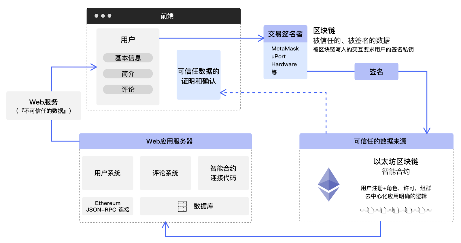 As we get to know more about blockchain and smart contracts, we will find that actually blockchain and smart contracts are just a small part of a complete application. Relying solely on blockchain and smart contracts themselves is far from enough to build a complete user experience application. From this perspective, the position of blockchain and smart contracts in a system is similar to that of databases and stored procedures in the system. They are both at the core of the entire system, but to form a complete user-friendly application, cooperation from other parts is necessary.