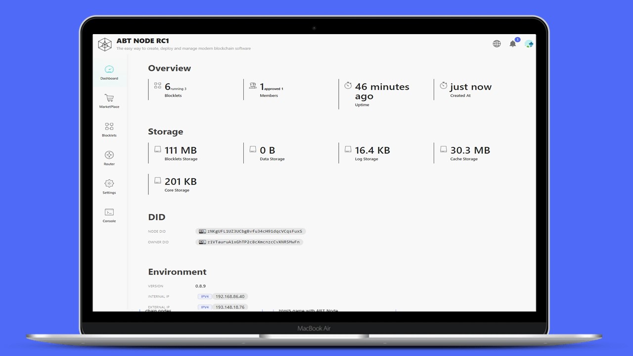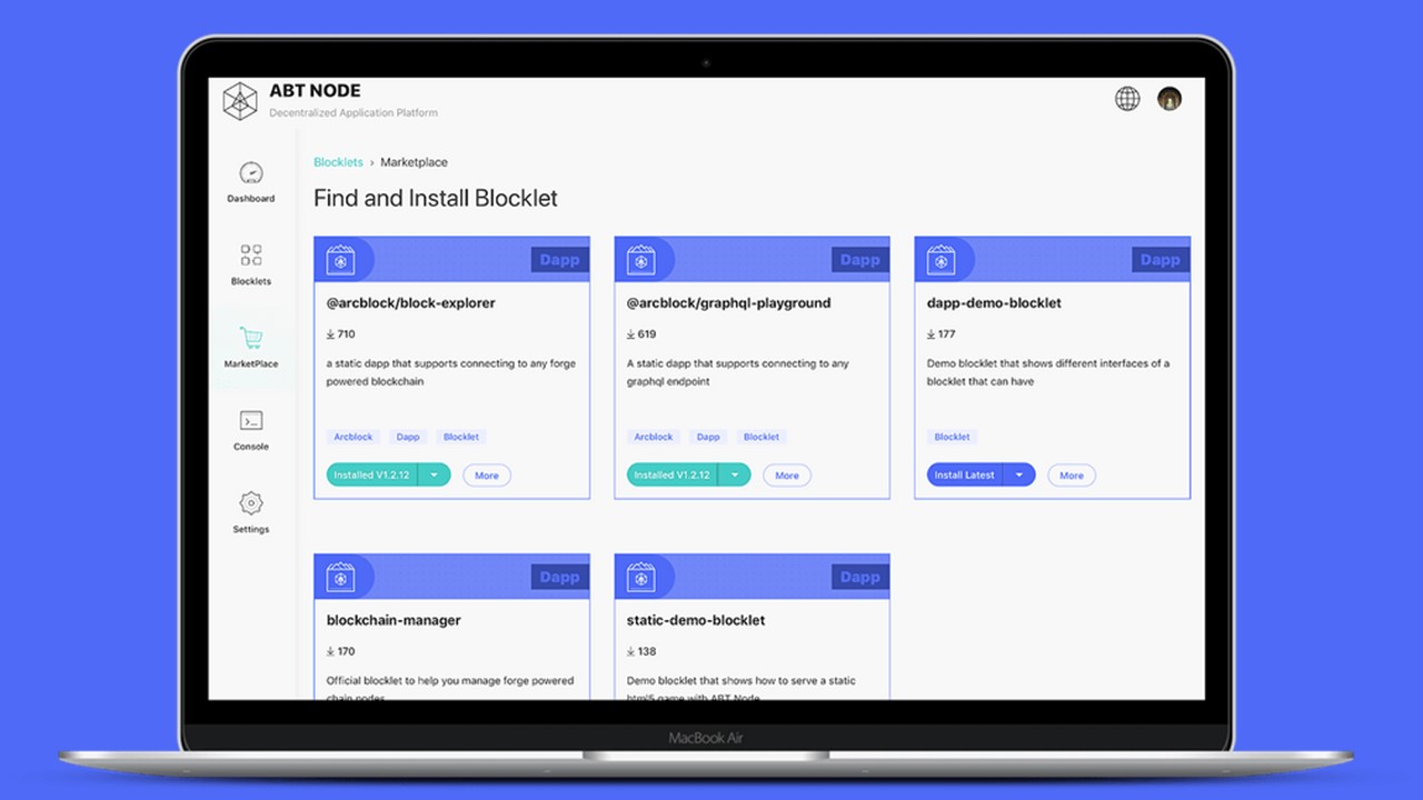 To help users find, use and share Blocklets, ABT Node features a Marketplace that hosts ready-made Blocklets including open source tools, ArcBlock's blockchain manager, games, website builders, backend services like AWS QLDB and much more. With the marketplace, users can easily share their newly created Blocklets, or use Blocklets from the marketplace to extend the capabilities of ABT Node or project in just a few clicks.