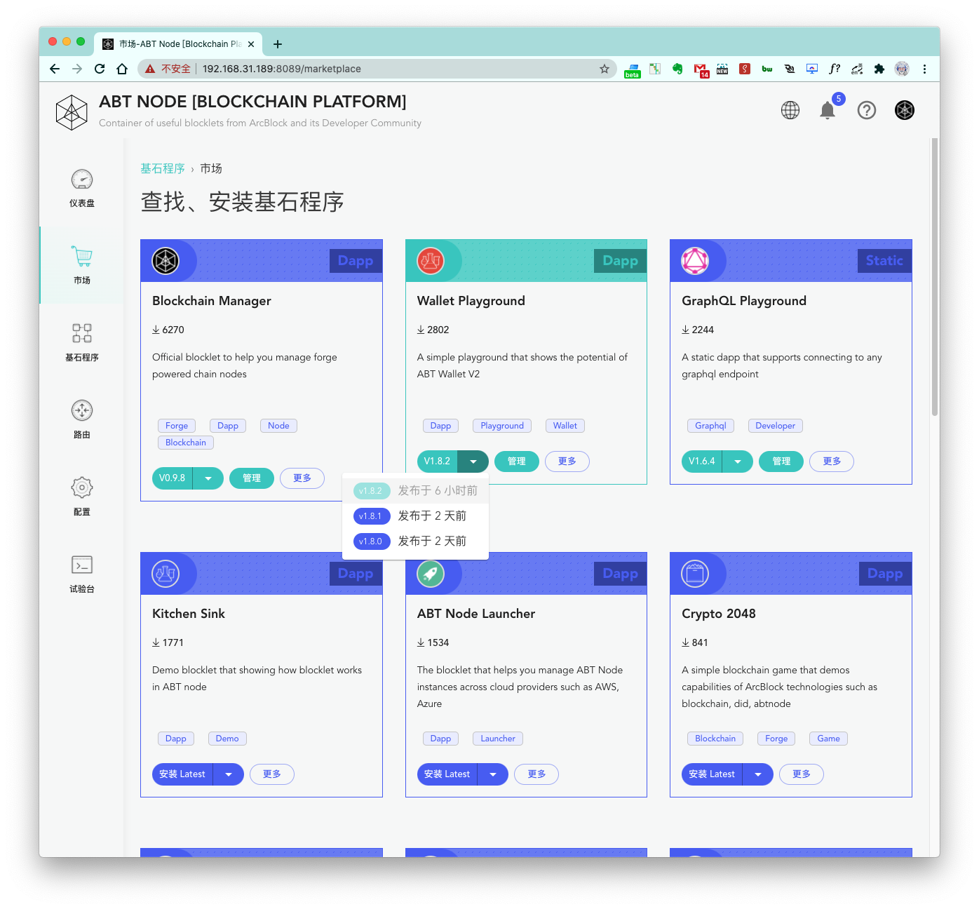 在 市场 页面,找到您已经安装的 Blocklet 卡片,您可以在卡片上点击版本列表完成版本升级或者降级操作。