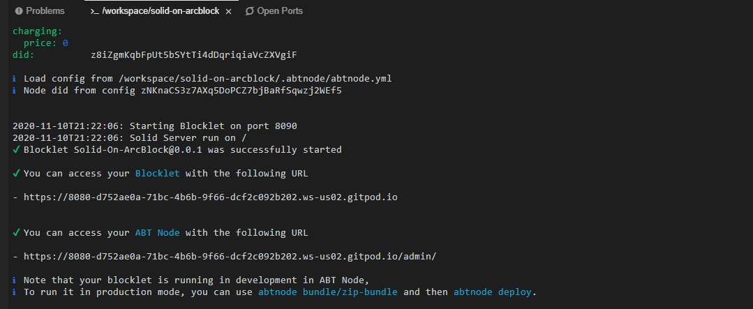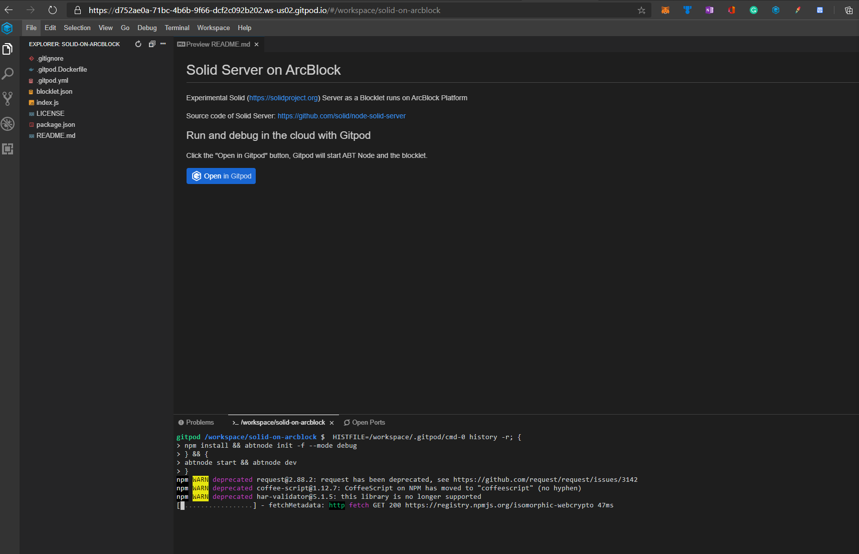 Using the blocklet, developers get everything they need to run the Solid Server with no additional dependencies, configuration updates, and can be launched in one-click. Once launched, developers can quickly demo Solid Server inside of Gitpod's Cloud IDE with built-in web preview and instant access ABT Node's dashboard.