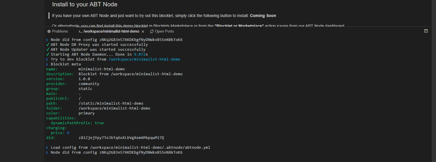 - At this step, our ABT Node and Blocklet have been deployed and your blocklet meta are listed. In this final step, the system will confirm that your static blocklet is ready on port 8090 from /workspace/minimalist-html-demo, and the URLs to access your Blocklet and ABT Node.