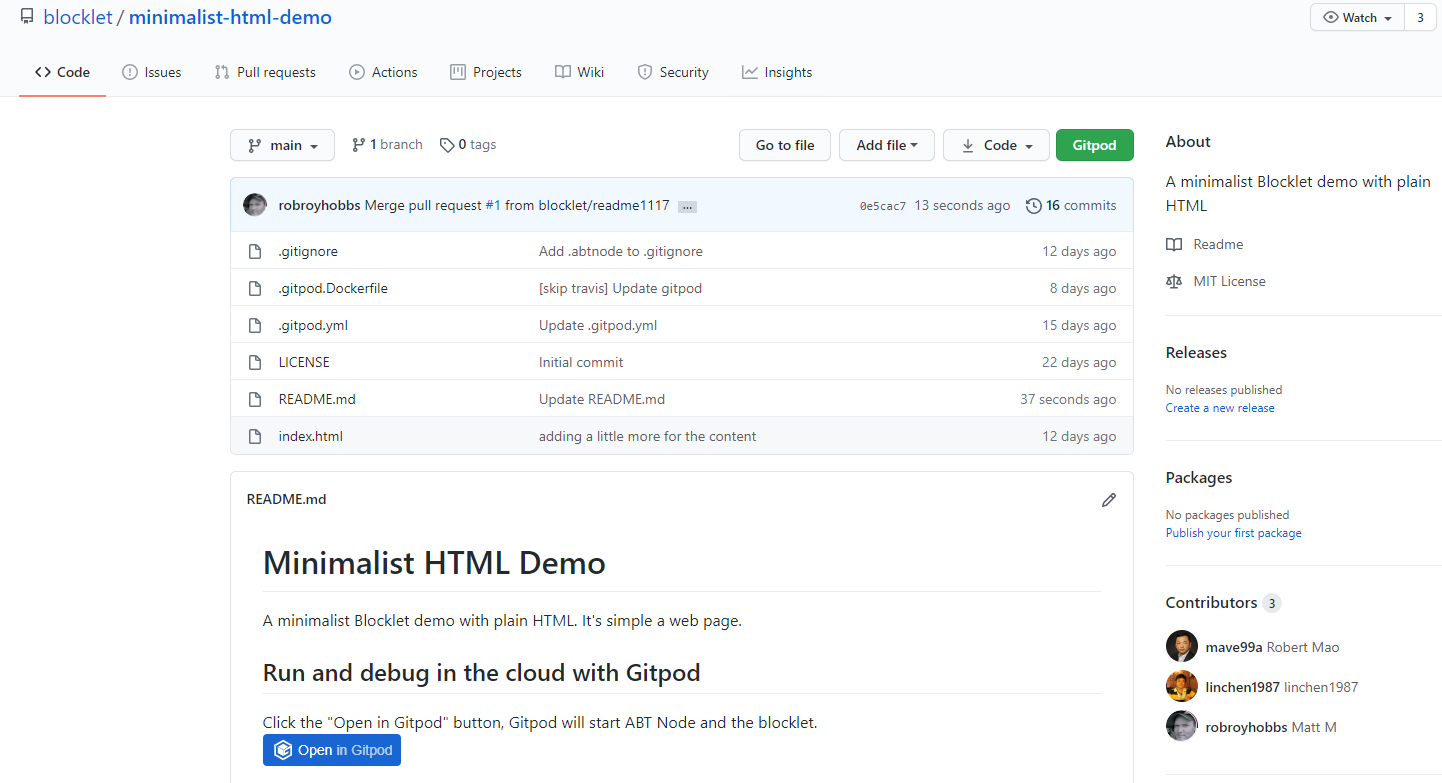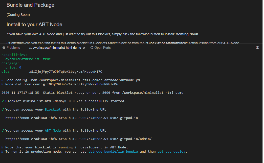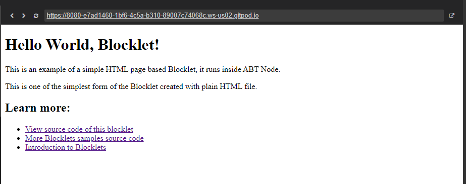 - Click on the [Open in Gitpod](https://gitpod.io/#https://github.com/blocklet/minimalist-html-demo) button and your cloud developer environment will automatically launch in your browser.