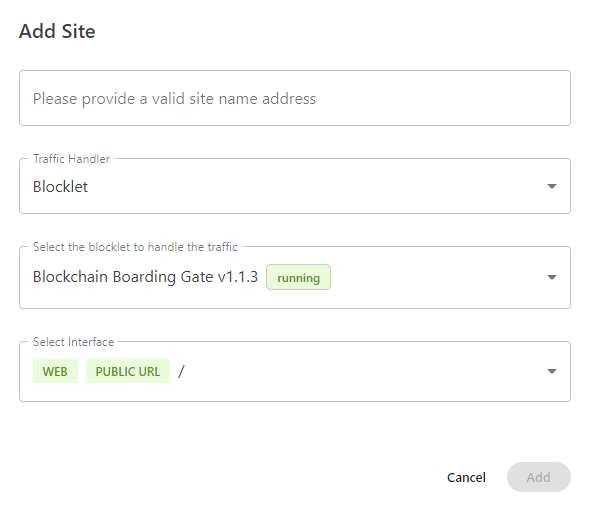 - Now, enter in your details for your Blocklet. In this example, we will associate our domain address with our Boarding Gate Blocklet to enable anyone to easily register a new account on our blockchain.