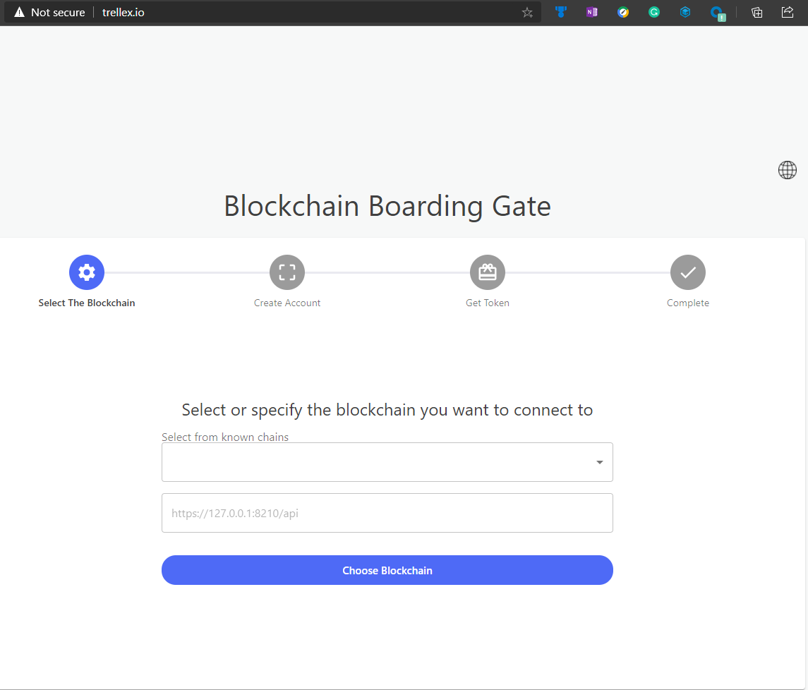 - Let's try it. Go to your browser and enter in your domain name that your setup. In this case, we setup trellex.io and we can see the Blockchain Boarding Gate Blocklet is ready to use. Great work.