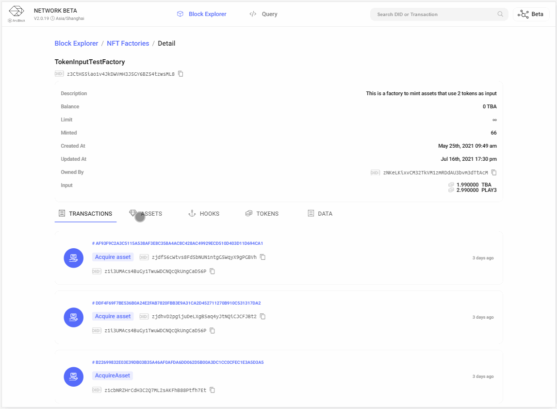 In the NFT Factory details (below) you can see the Factory description, production limits, the number of NFTs produced, the creation time, the creator DID and the number of Tokens required to create an NFT and other basic information, below the basic information you can see the transactions related to the NFT Factory, the list of NFTs produced, Hooks, Tokens and meta information about the NFT Factory.