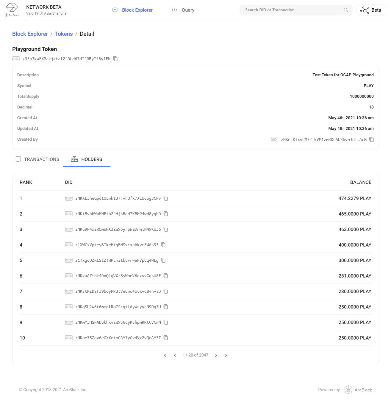 In the Token details page (below), you can see the Token's description, symbol, total number of issues, precision, creation time, and creator DID, etc. Below the basic information, you can see the Token's related transactions and holder accounts, where the list of holder accounts is sorted by the number of Tokens held.