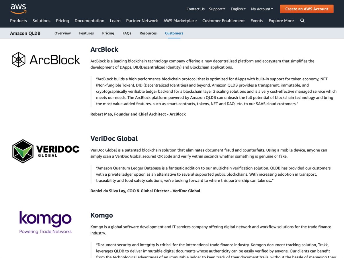 Sep 23th. Amazon Web Service (AWS) official site just featured ArcBlock and other 10 customers and partners on Amazon Quantum Ledger Database (QLDB) customers page.