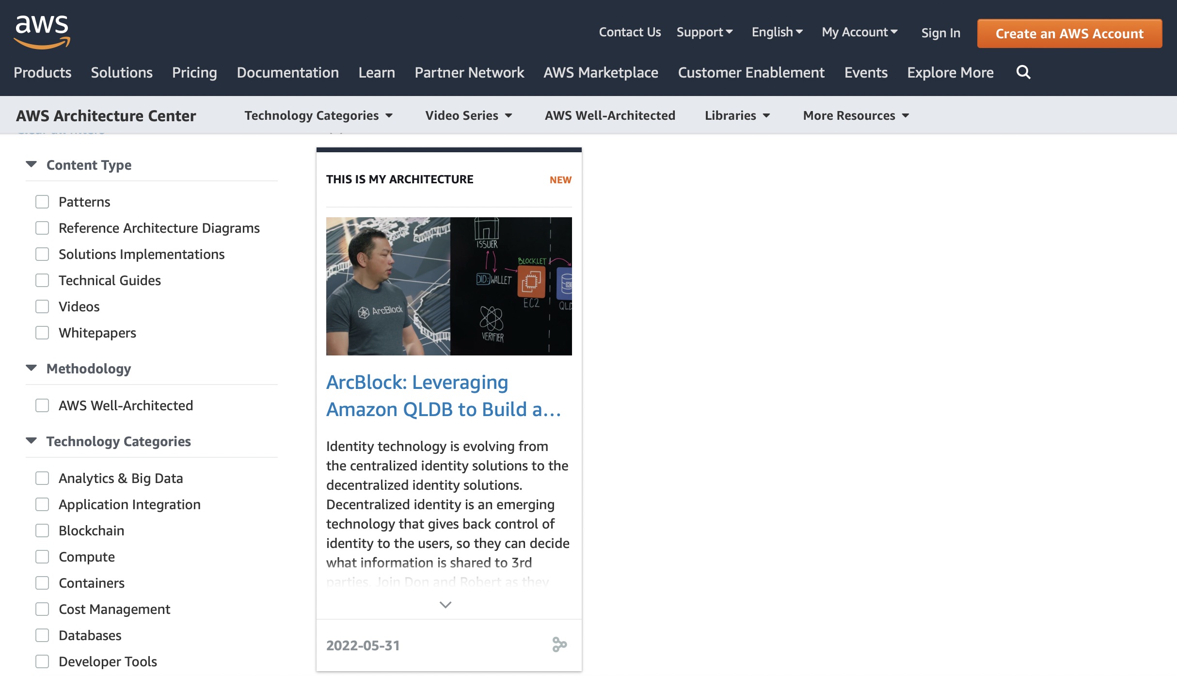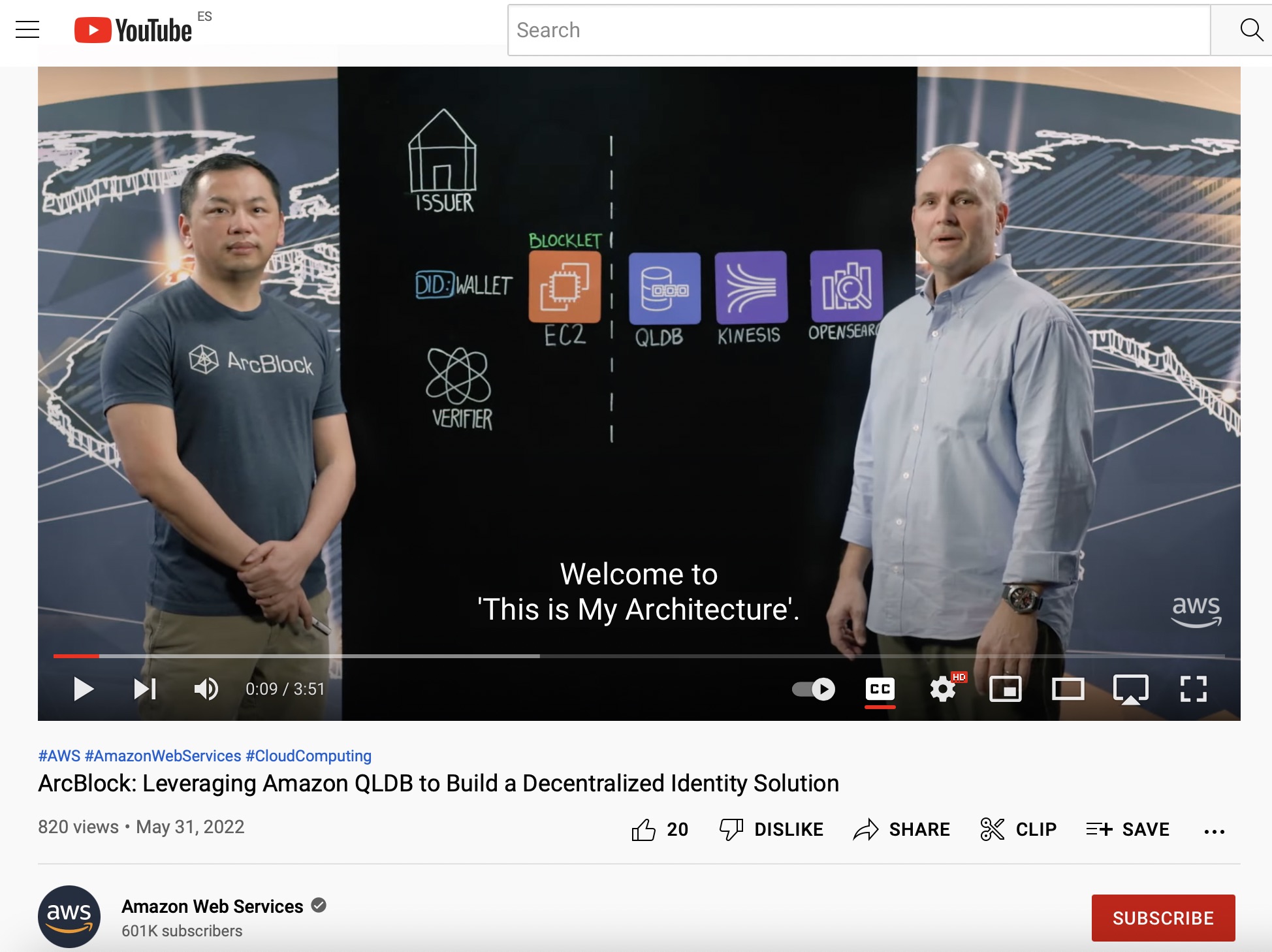 (May 31, 2022) Amazon AWS has posted a video interview on its Youtube channel and social media, "ArcBlock: Leveraging Amazon QLDB to Build a Decentralized Identity Solution " (https://www.youtube.com/watch?v=o6DZRwe30Ls), an edited version of a conversation between Amazon Architect Don Simpson and ArcBlock CEO Robert Mao at the 2021 AWS Reinvent event.