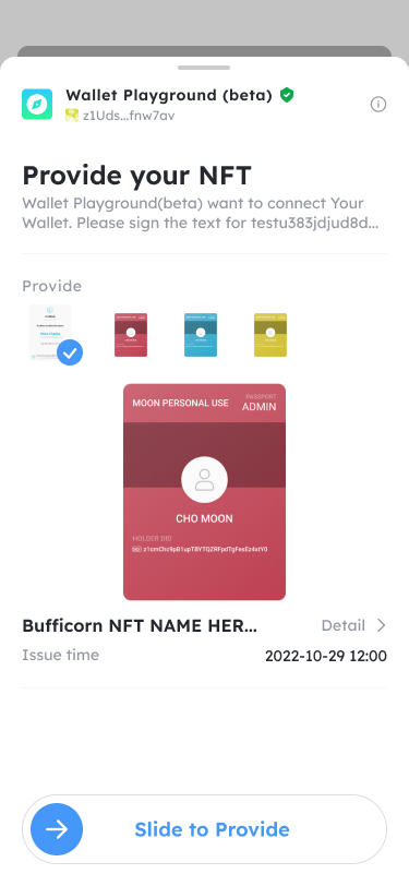 Based on the DID Connect protocol, we let the NFT data capabilities come into play, a Dapp can initiate a request for NFT proof of ownership from a user with specific rules, based on which a decentralized permission control system can be implemented using NFT.