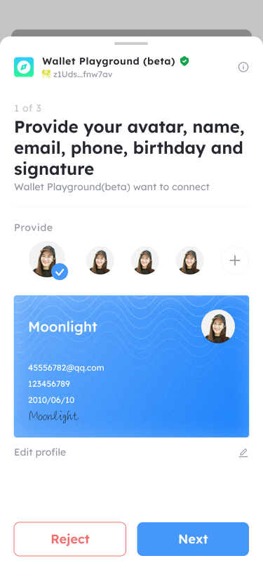 The DID Connect feature built into the DID wallet makes it very easy to process profile requests, and allows users to freely choose which profile they are currently using to access the Dapp, and of course the Dapp can customize its own rules for requesting profile information.