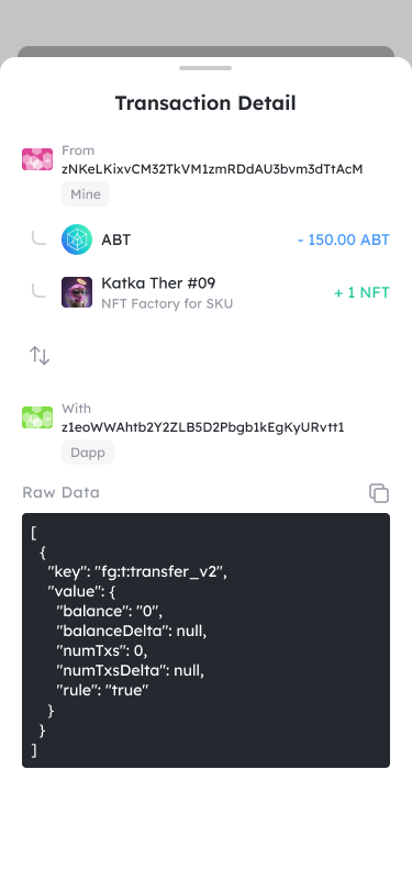 This transaction is for the NFT Store to ask me to sign a transaction at ArcBlock Main chain that will get me an NFT that looks like this and requires me to pay 150 ABT.