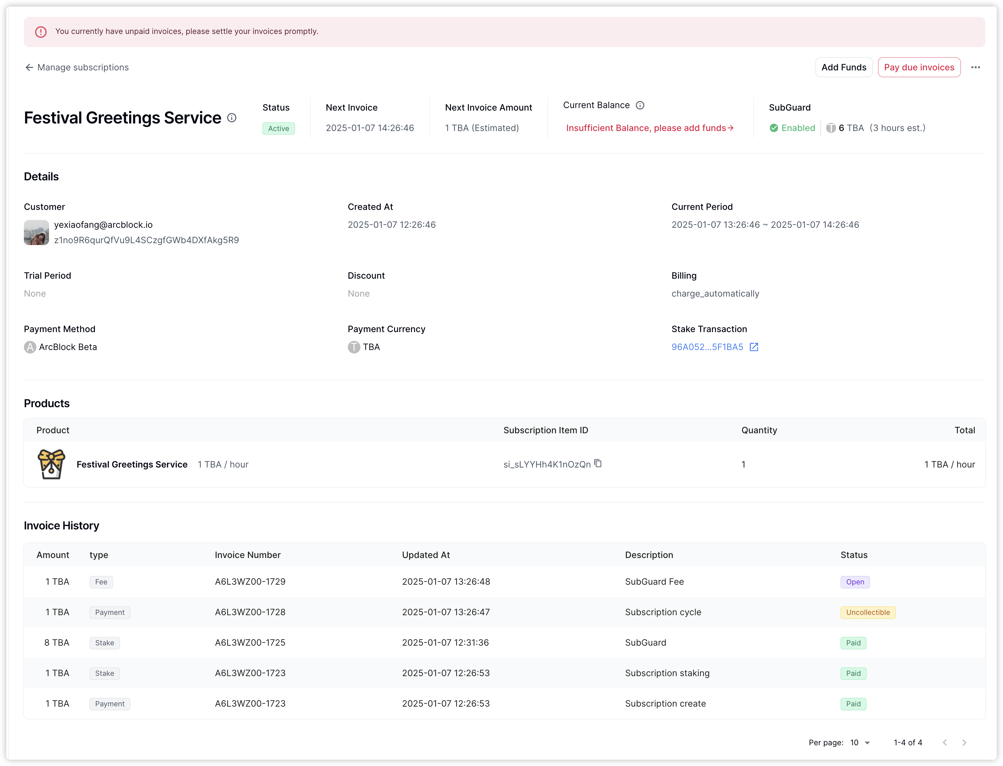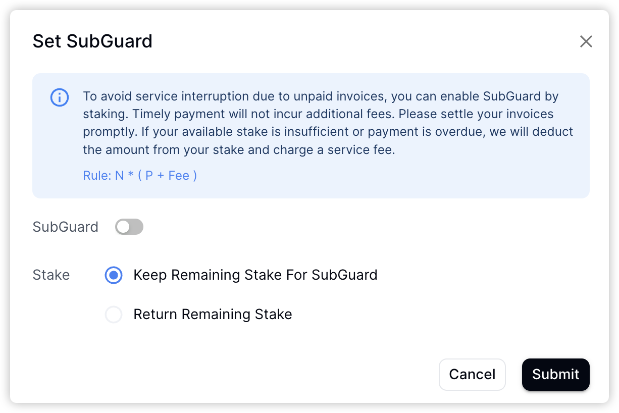 - 结清账单后,用户可以随时停用订阅守护服务。用户可以自主选择是否退还质押,订阅如果取消,系统将自动退还剩余质押。