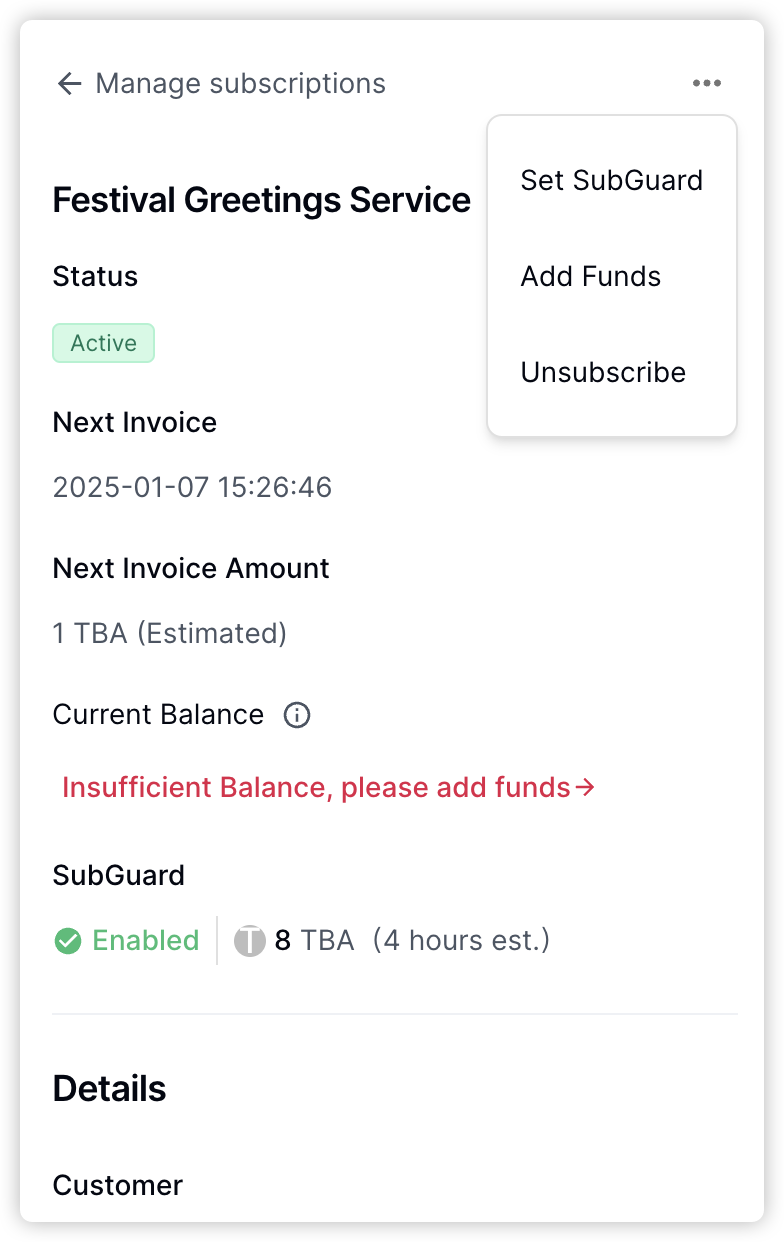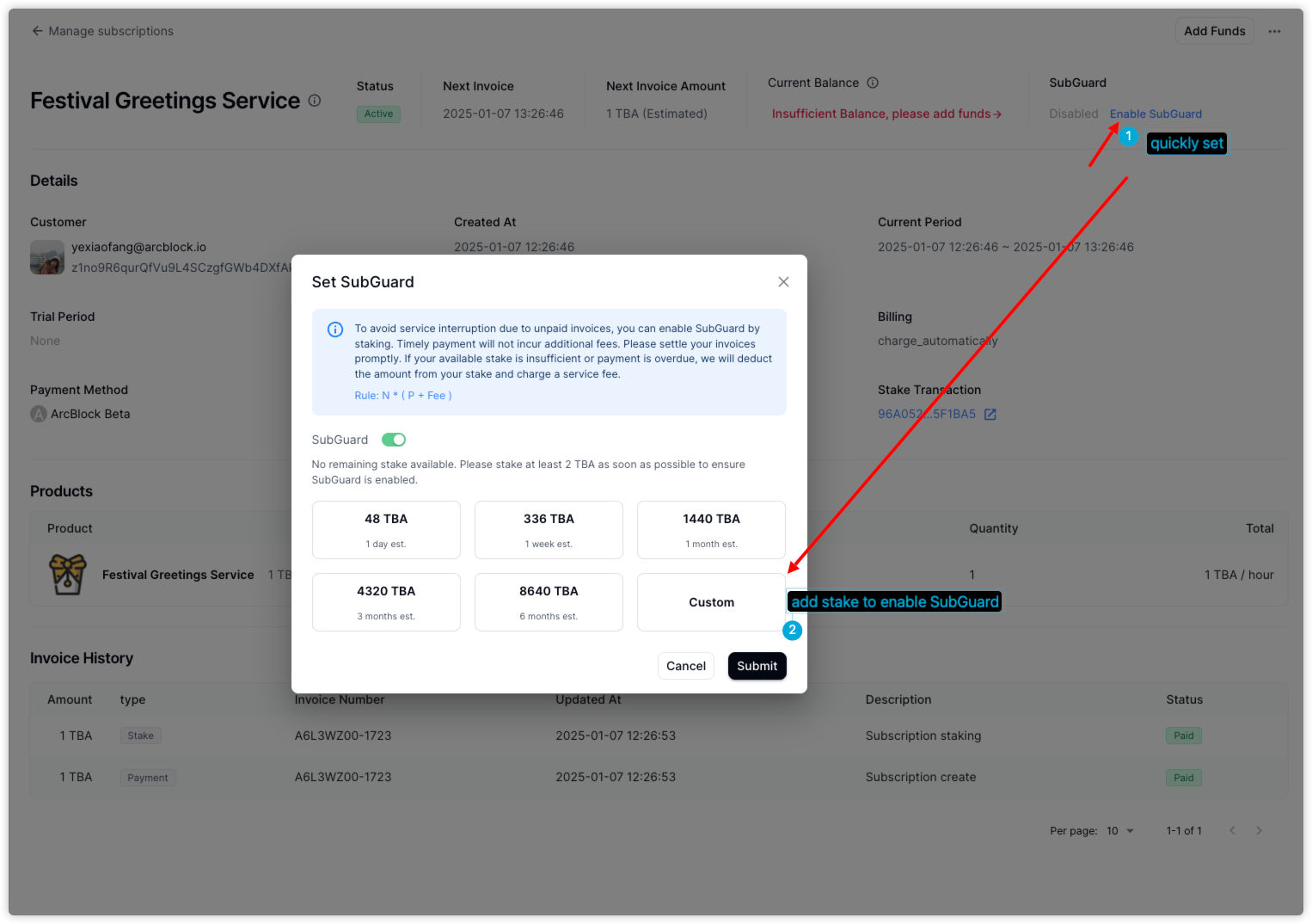 订阅守护服务(SubGuard™ ) 是此次更新的一大亮点,旨在确保订阅服务的连续性,避免因扣费失败导致服务中断。通过设置质押金额,用户可以在订阅周期内获得全面的保护,确保服务不受影响。用户可以在订阅详情页开启该功能并设置相应的质押金额,系统会根据保护周期确保扣费失败的情况不会影响到订阅服务。