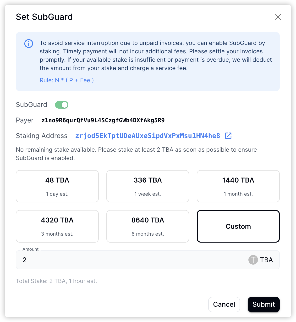 - 质押金额要求: 质押金额包括预估账单金额和订阅守护服务费,至少需质押一个周期的账单费用。