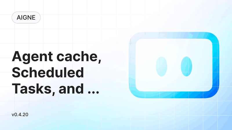 在过去的两周内,我们积极倾听并响应用户反馈,通过快速迭代不断优化 AIGNE 的功能。今天,我们发布了 v0.4.20。这个新版本引入了增强的 Agent 缓存机制,支持定时任务功能,并增加了流式响应,为开发者和用户提供了更强大的工具。这些新特性不仅大大帮助了 Agent 开发者,也显著提升了用户体验。接下来,让我们一同深入了解这些精彩的更新,探索新版本带来的全新可能性吧: