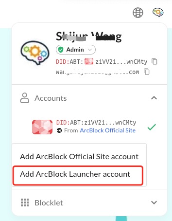 此时不要惊慌,你的账户并没有消失,而是账户 ID 发生了变化,下面介绍以 Blocklet Launcher 为例说明把老账户添加回来的步骤(同样的方法应该也适用于 ArcBlock 的其他服务,比如 Blocklet Store 和 DID Spaces):
