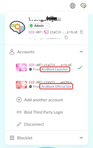 1. 登录到 Blocklet Launcher,点击页面右上角,查看登录状态,应该看到当前登录到是 ArcBlock Offcial Site 的账户#