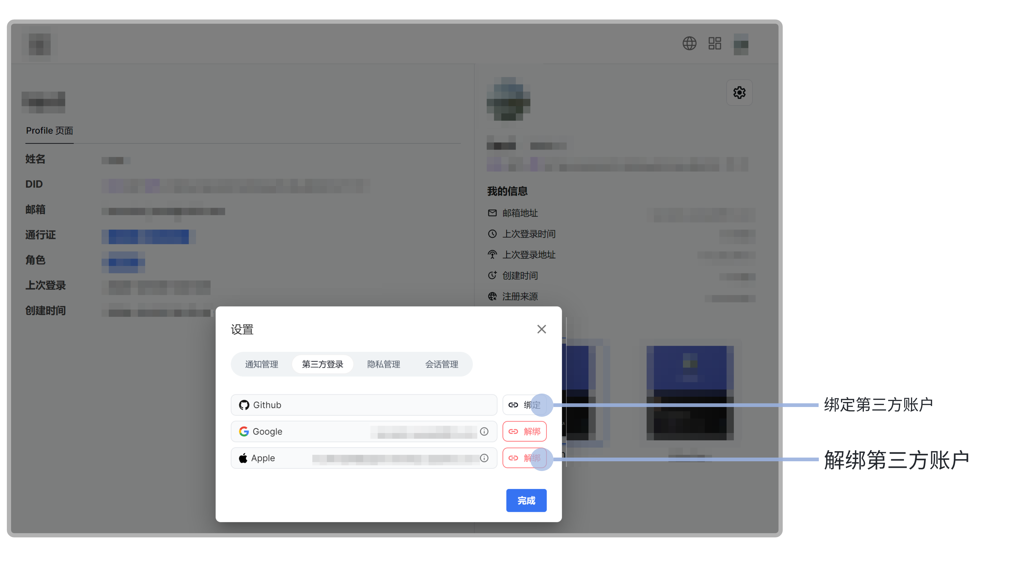 注意:如果这个第三方账号没有绑定过其他的 DID Wallet 账户,则会自动以当前的第三方登录来创建一个新账户(第三方账户会有部分功能限制)