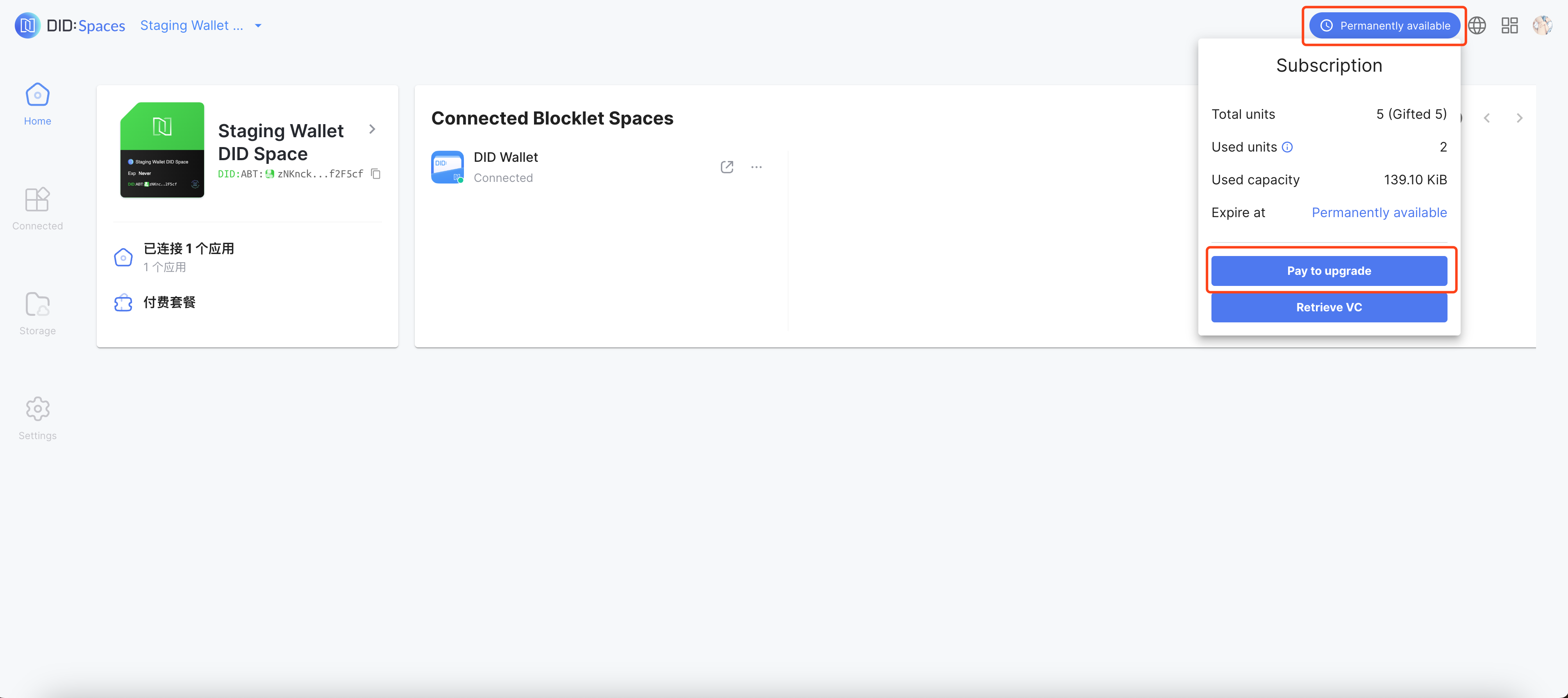 每个 Default Space 都会获赠 10 个免费单元,即使升级套餐赠送的计费单元依然有效。通过付费升级 Default Space,用户可以突破 Default Space 的单元限制。这样使用 Default Space 比直接购买 DID Space 更划算。下面是付费升级 Default Space 的 2 种方式,可根据自身的使用情况选择升级: