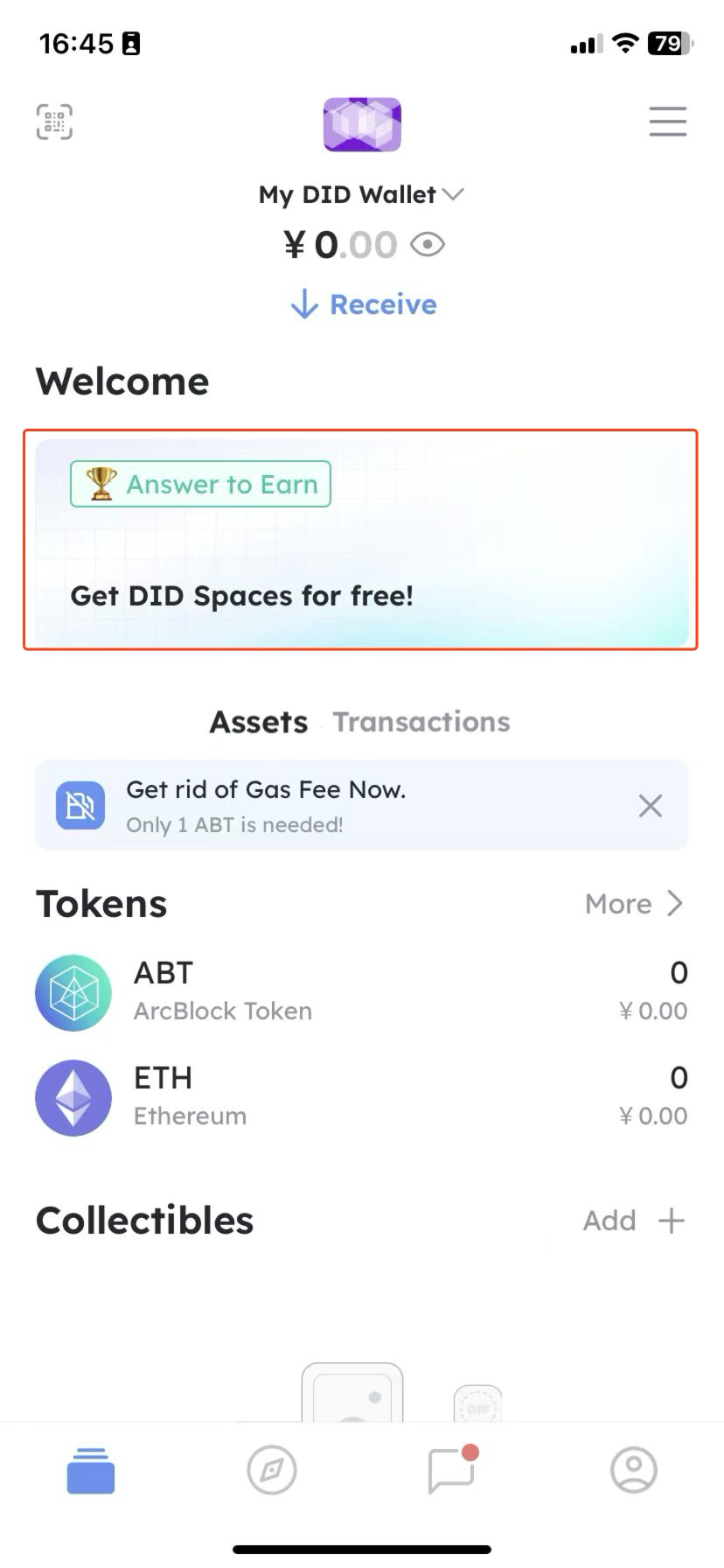 如果您还没有默认空间,您可以在 DID Wallet 客户端首页通过答题的方式免费领取。