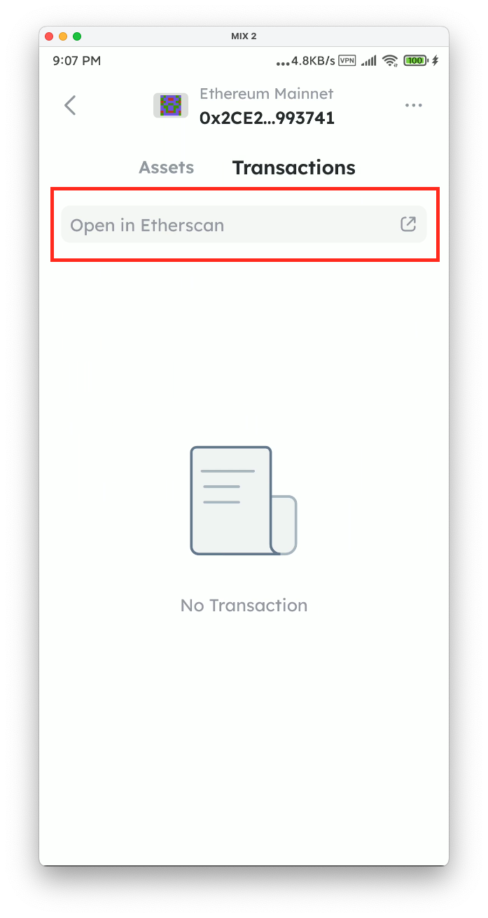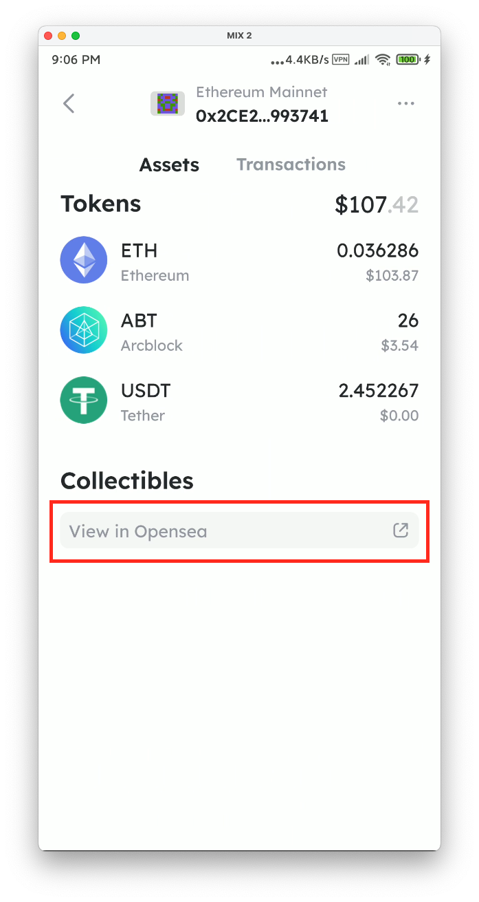对于以太坊账户,用户可以在钱包中的账户详情页面,一键直达 Opensea 查看 NFT 资产或者去 Etherscan 查看链上最新的状态或者交易记录。
