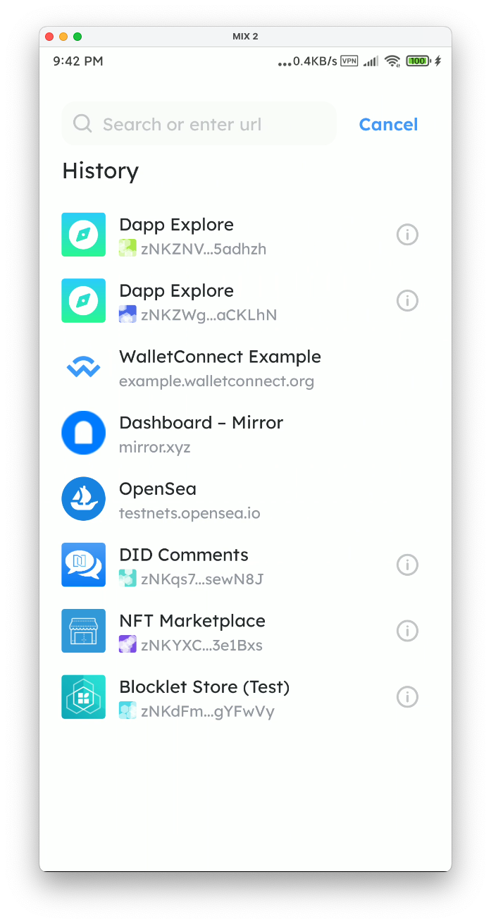 钱包中除了能记录 DID Connect 过的应用之外,现在也支持记录 WalletConnect 和 web3j 访问过的应用历史记录。