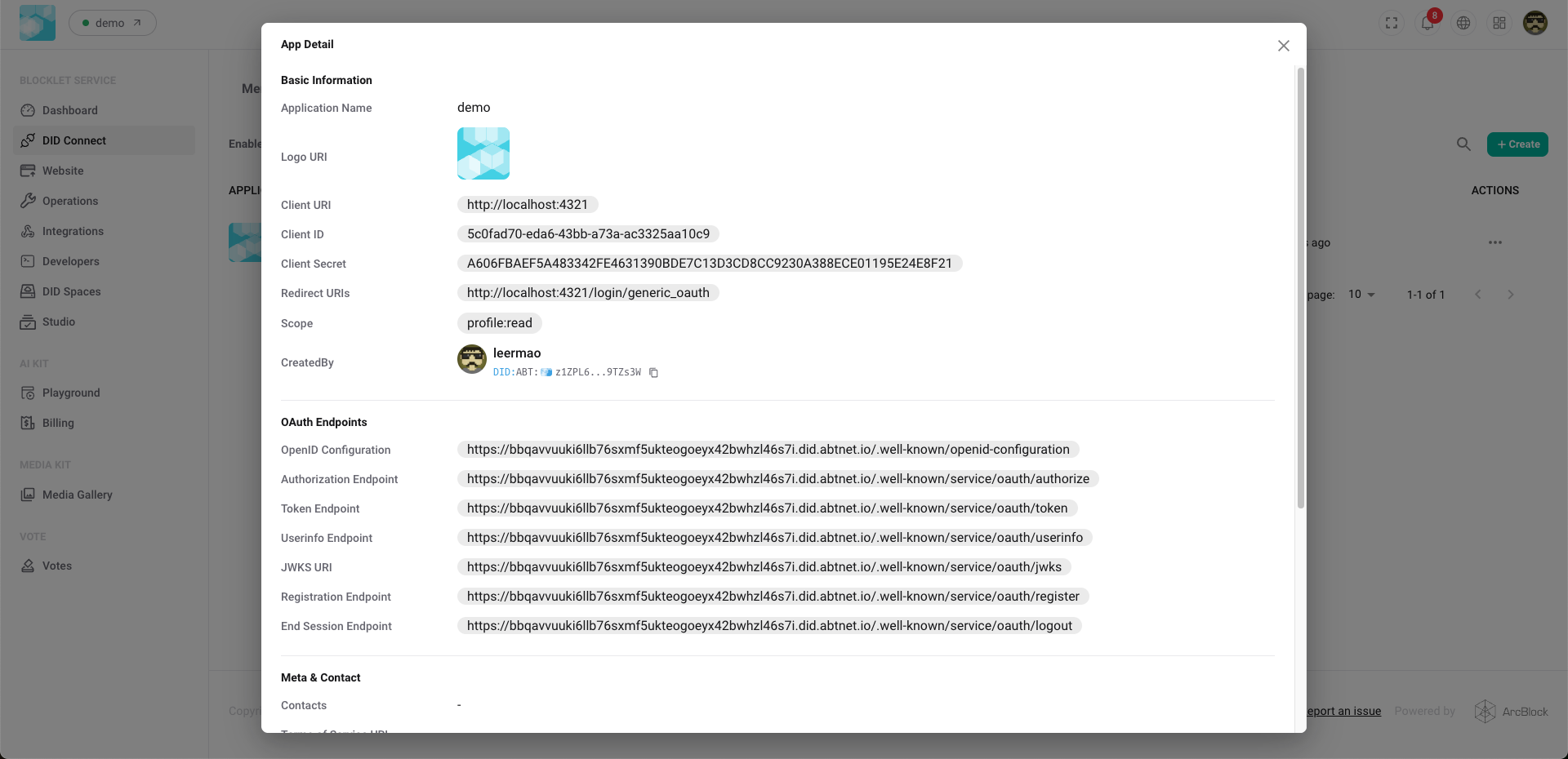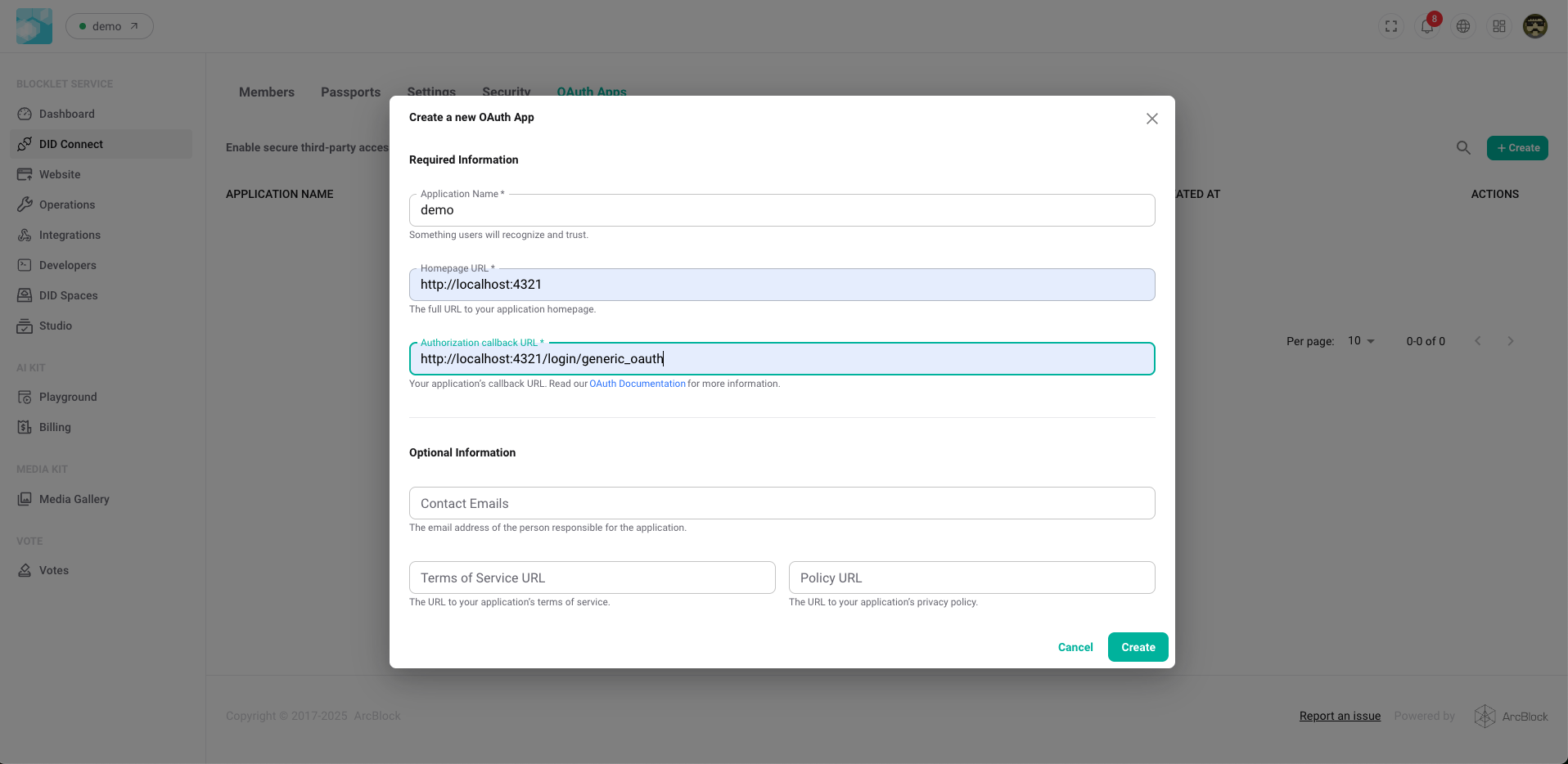 - Create a new OAuth App (DID Connect => OAuth Apps)