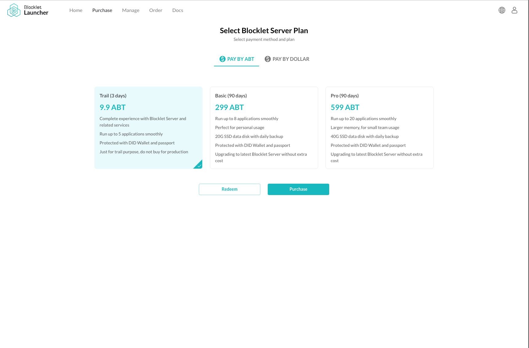 ArcBlock Launcher is a service that allows you to purchase Blocklet Server servers via ABT, credit card and other payment methods. This service eliminates the need to install environments or dependencies such as Node.js/Blocklet CLI/Nginx, and allows you to fill in simple configuration information to get a running server.
