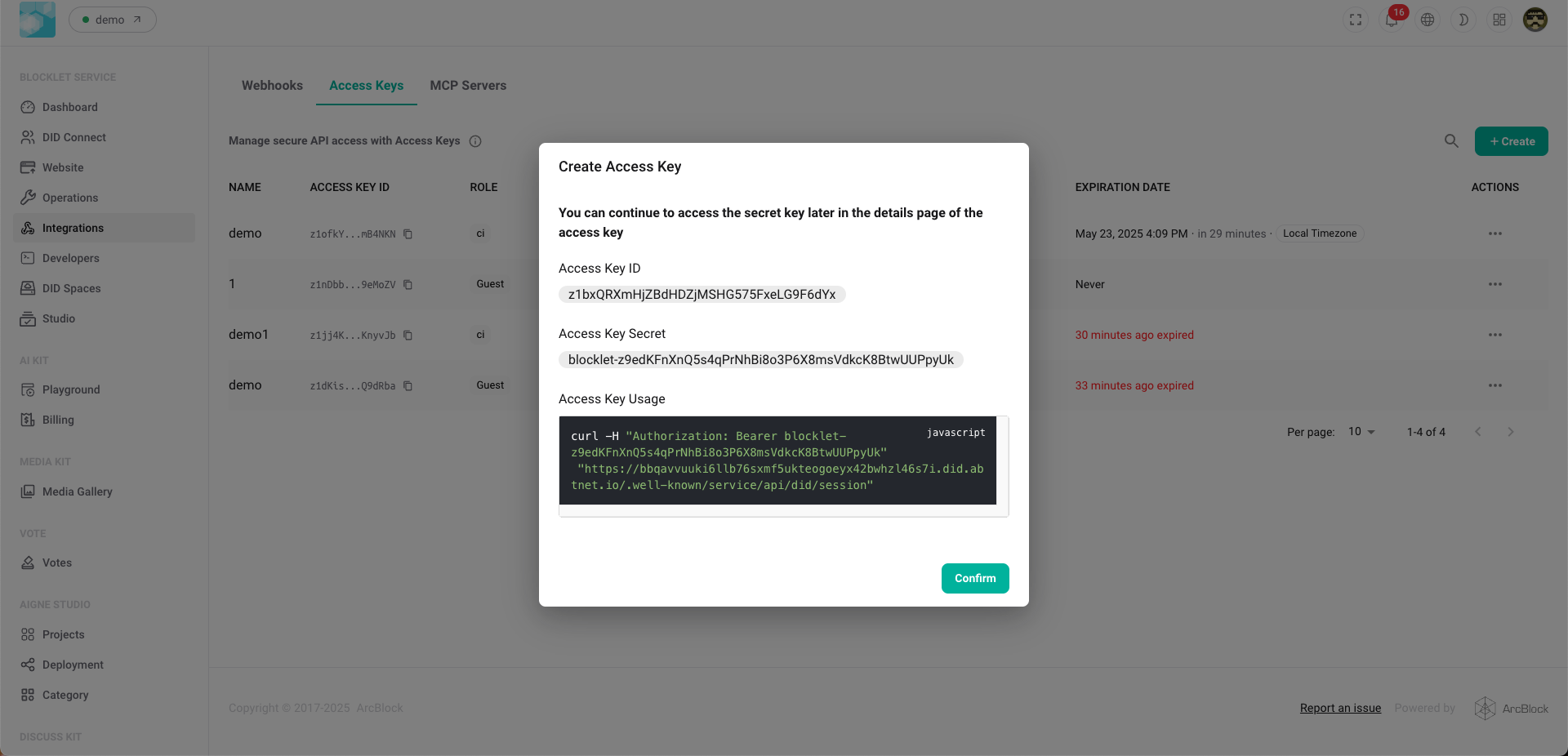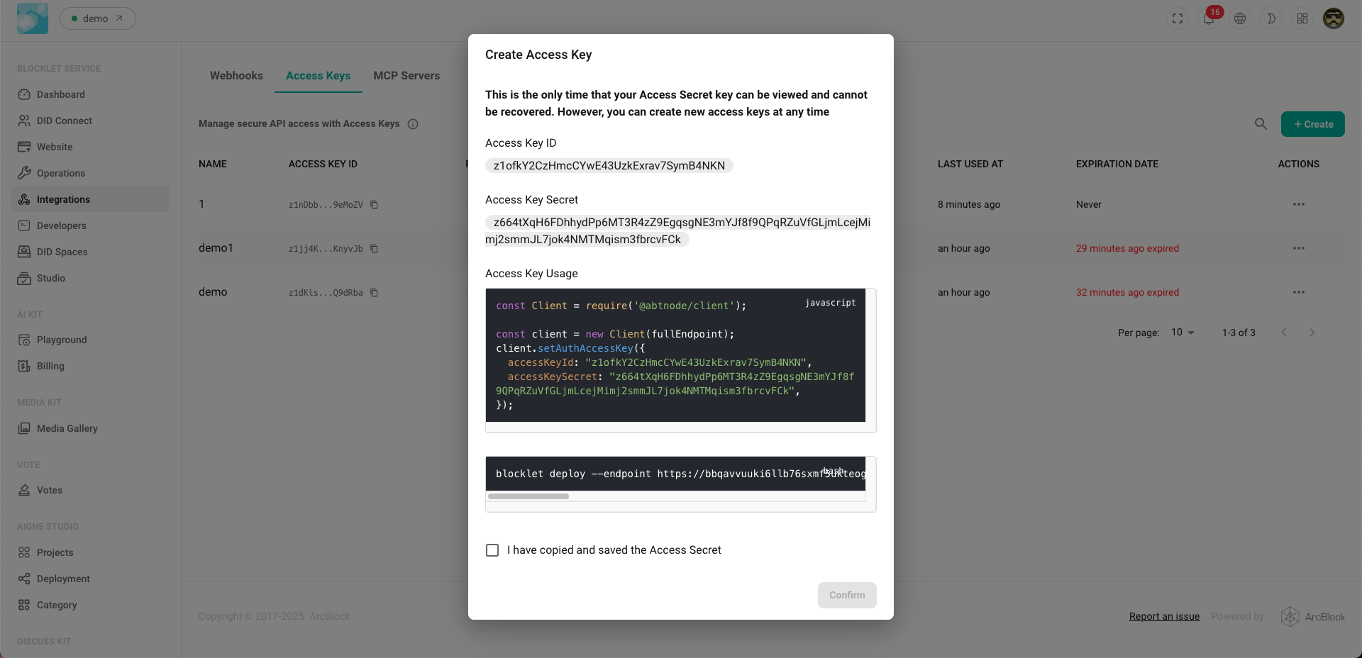 Note: Access Keys are not used for logging into the console. They are specifically designed for programmatic access to Blocklet data, such as via development tools like APIs, command-line interfaces (CLIs), and software development kits (SDKs). When you make a request using these tools, the request includes the Access Key ID and Secret, which are used to generate a signature that encrypts the request content. This signature is then used for authentication and to verify the request's legitimacy.