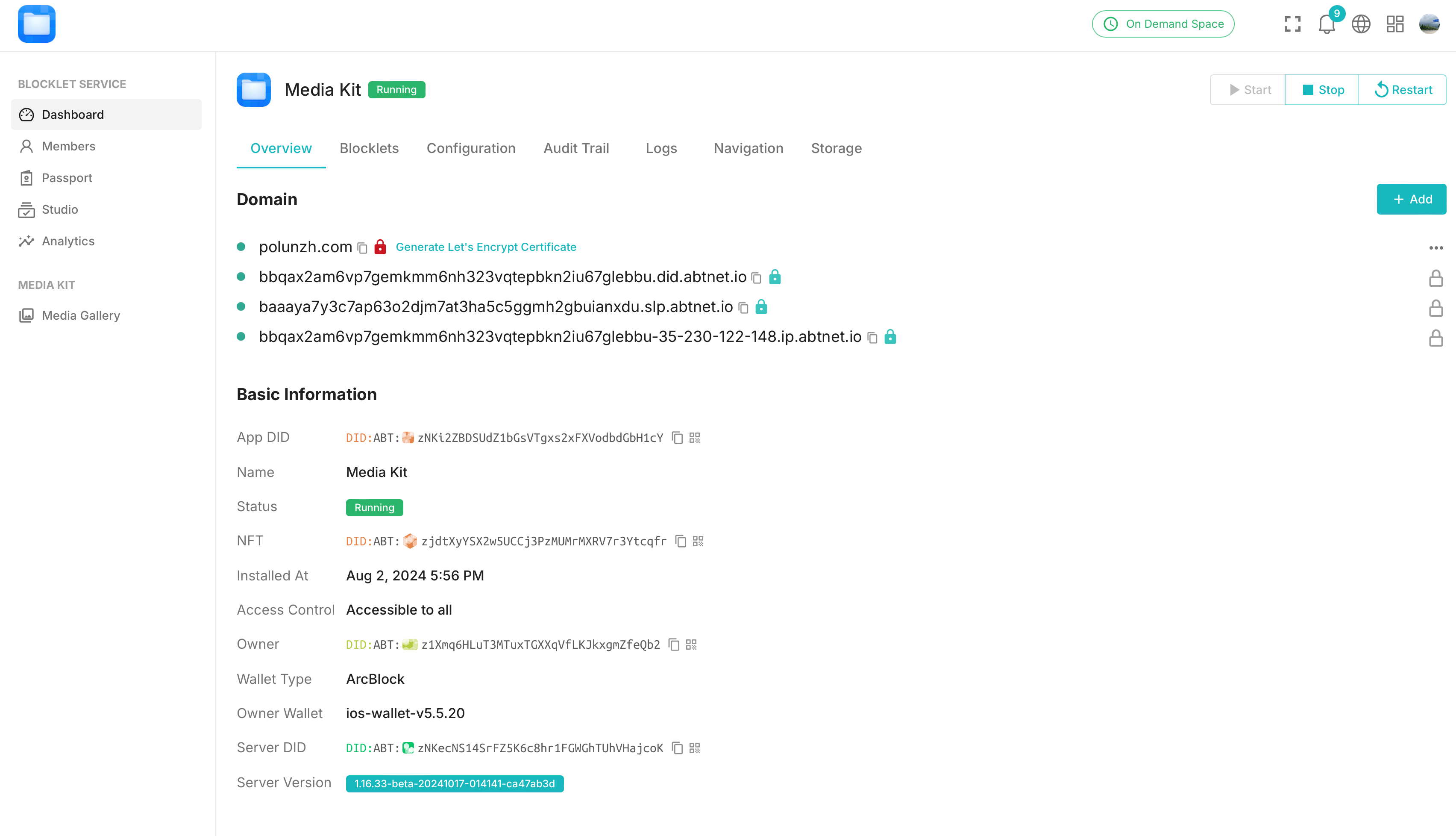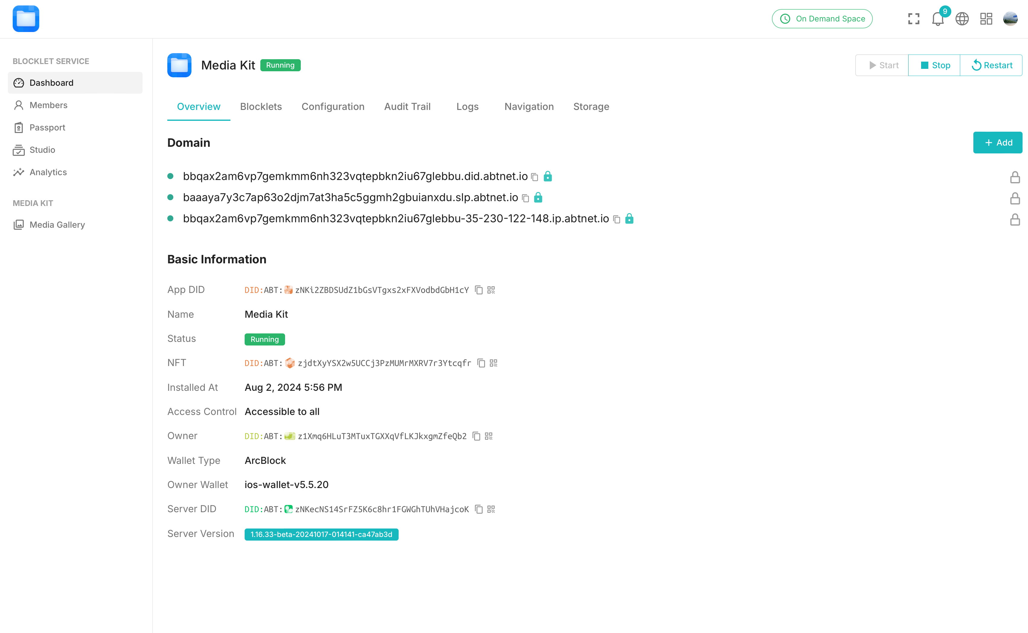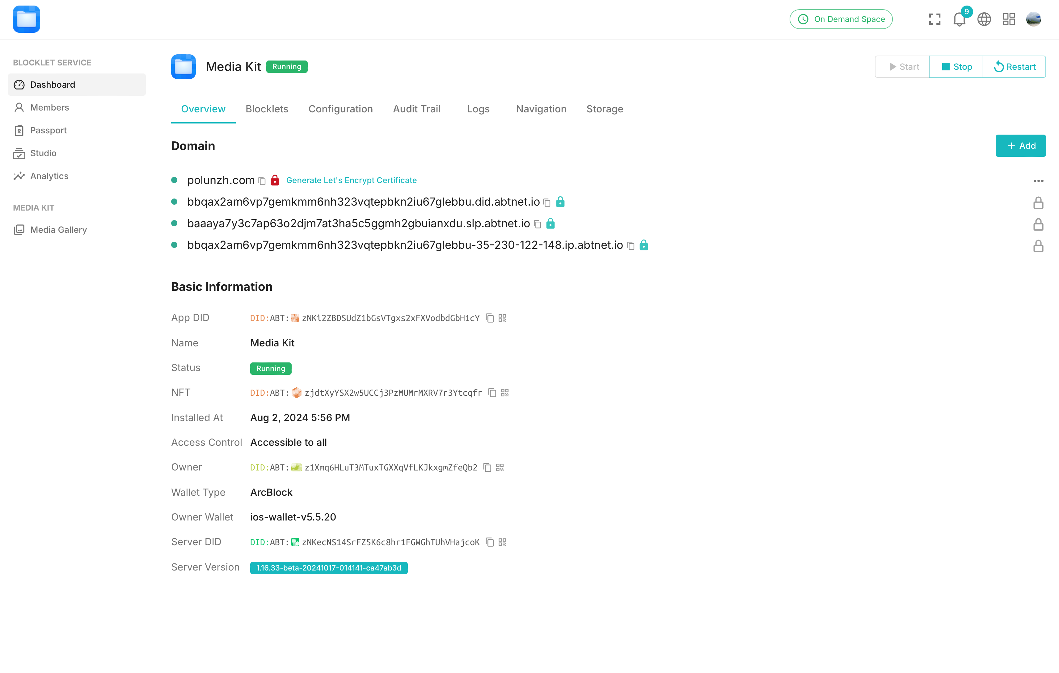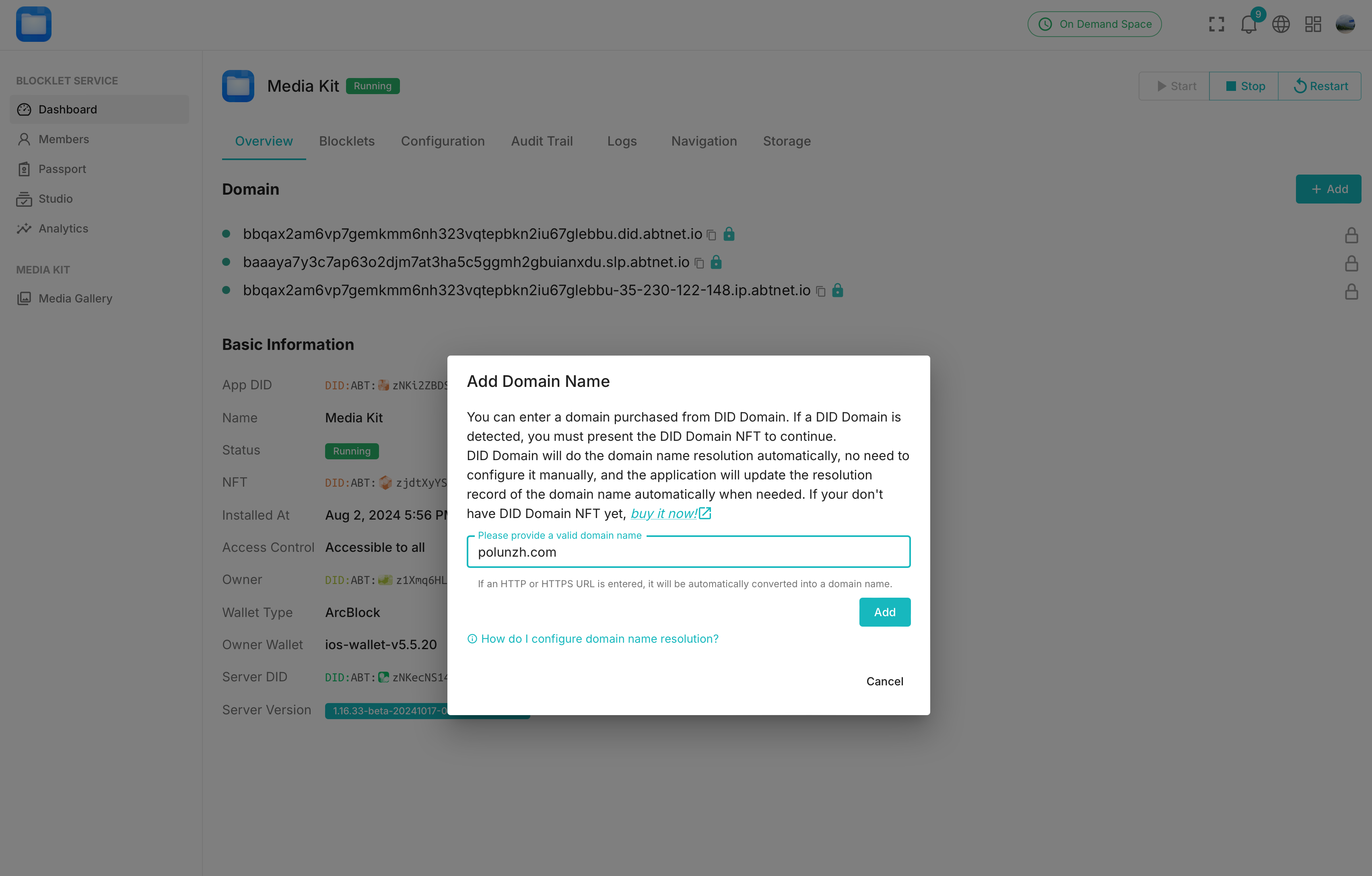 Dashboard -> Overviewpage of the Blocklet - Copy the DID Domain to prepare for adding DNS later.