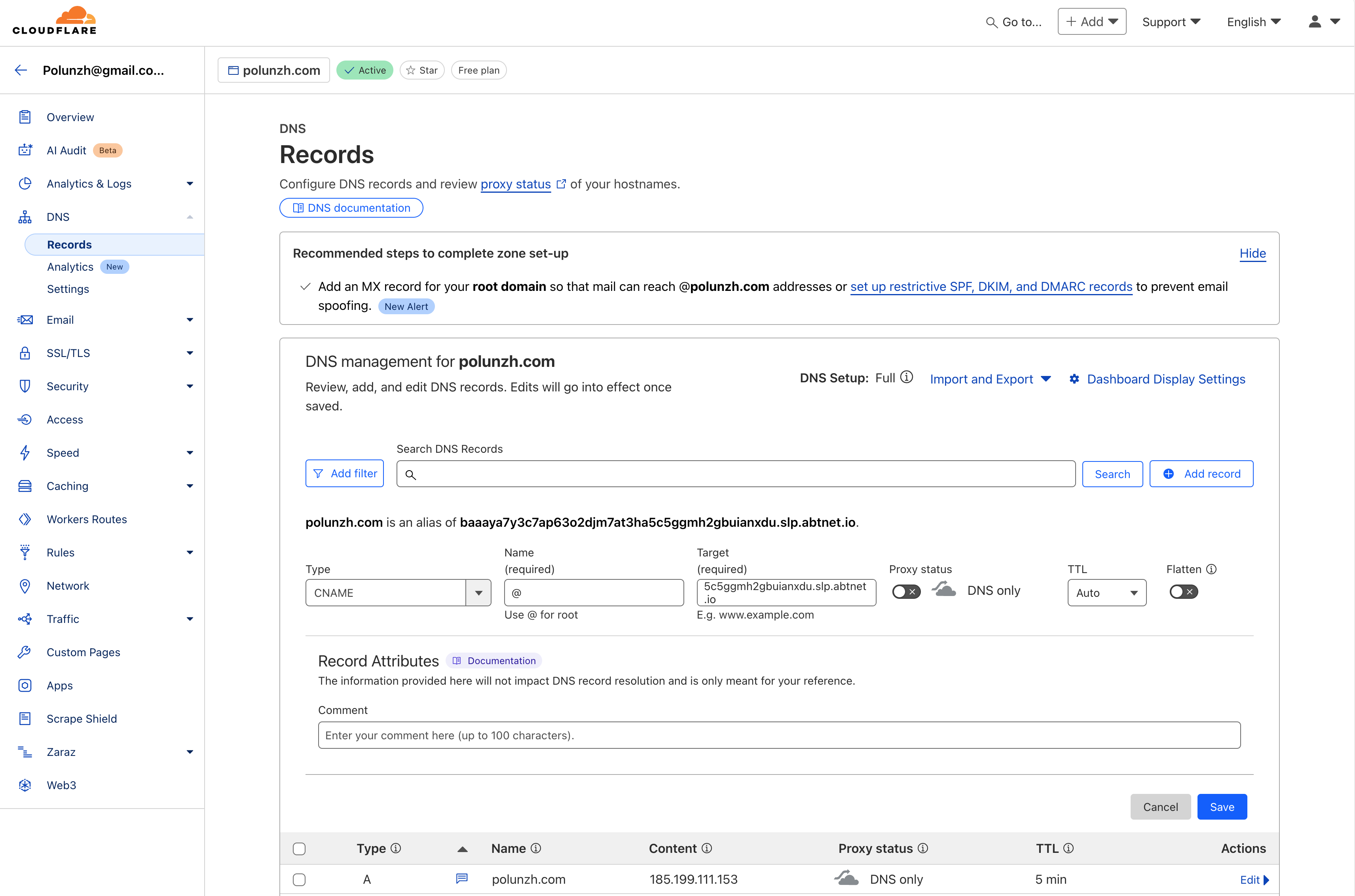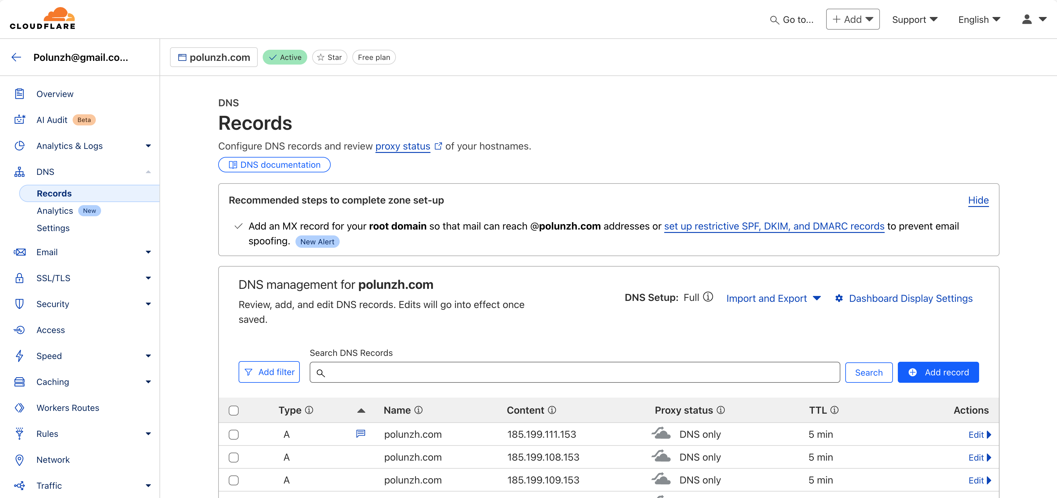 - Access the Cloudflare domain DNS configuration page and click the "Add Record" button.