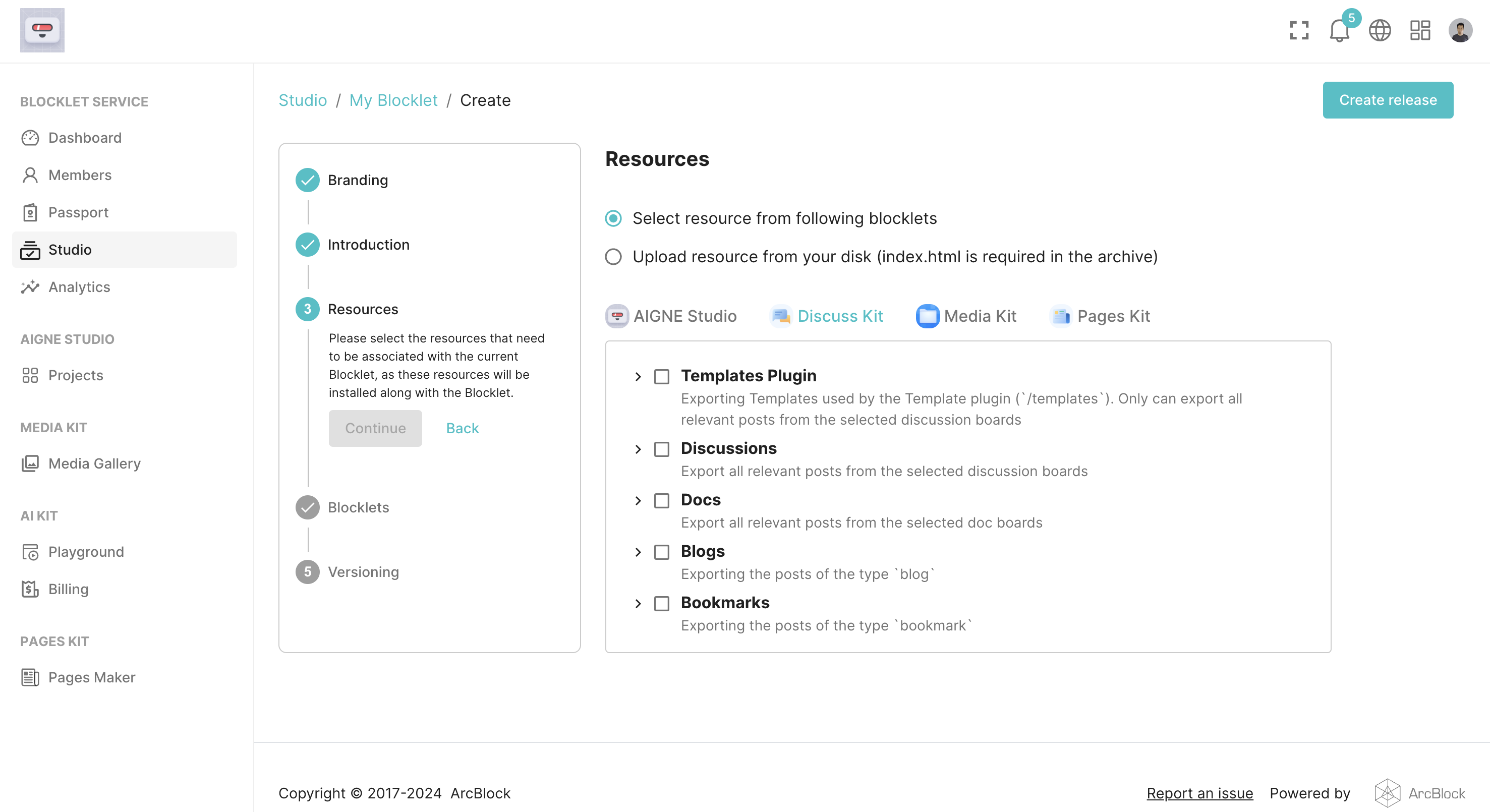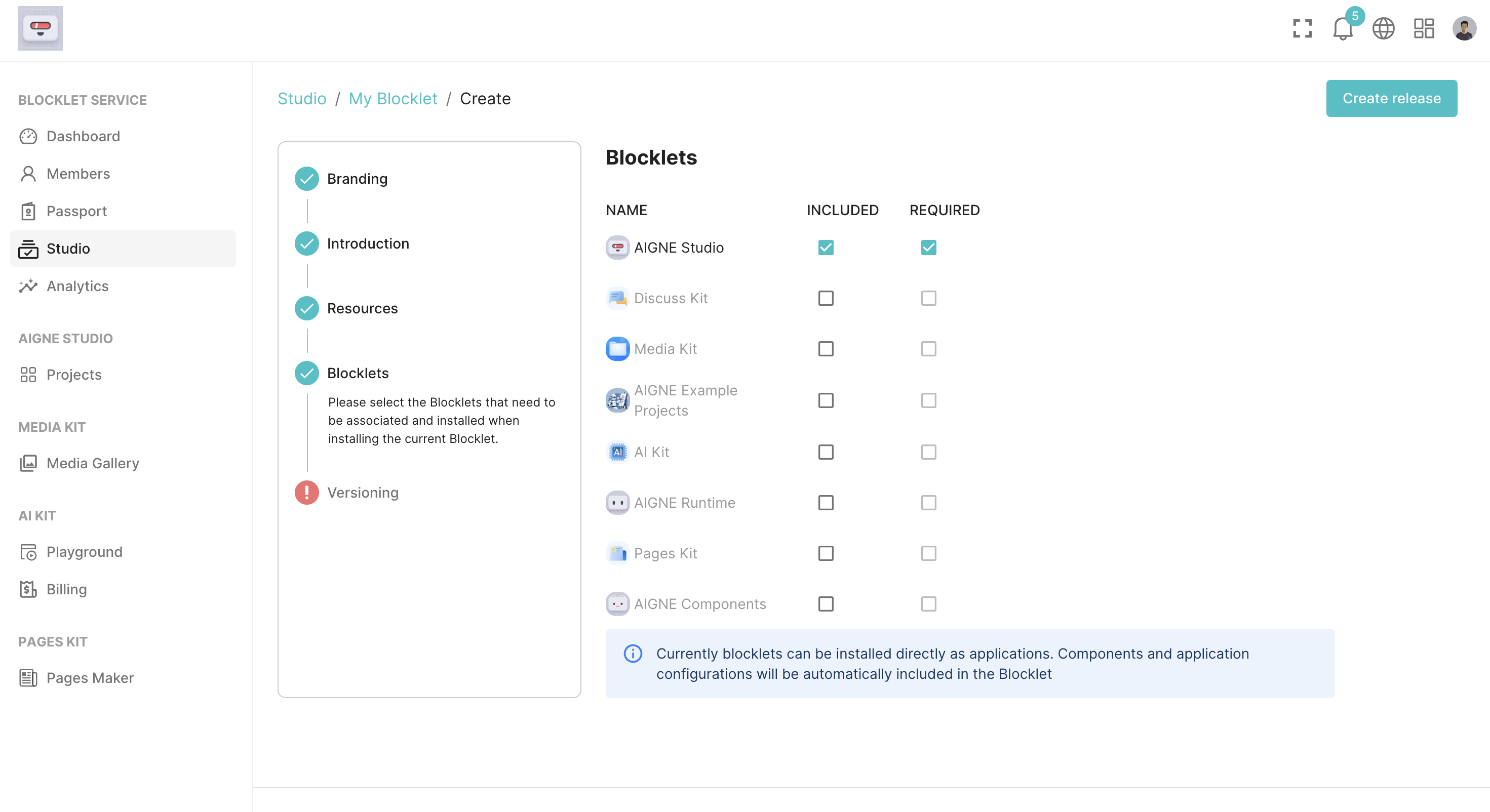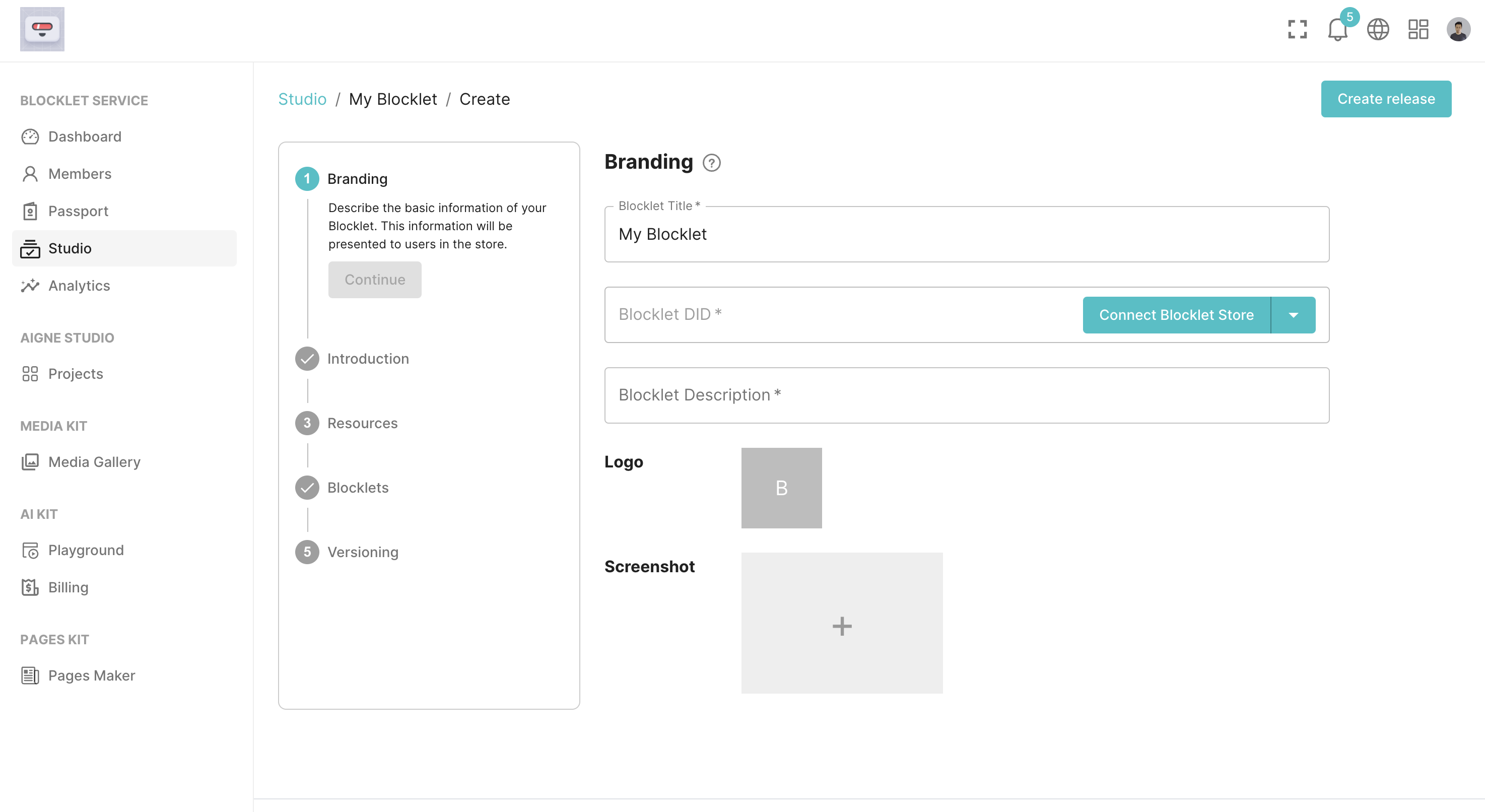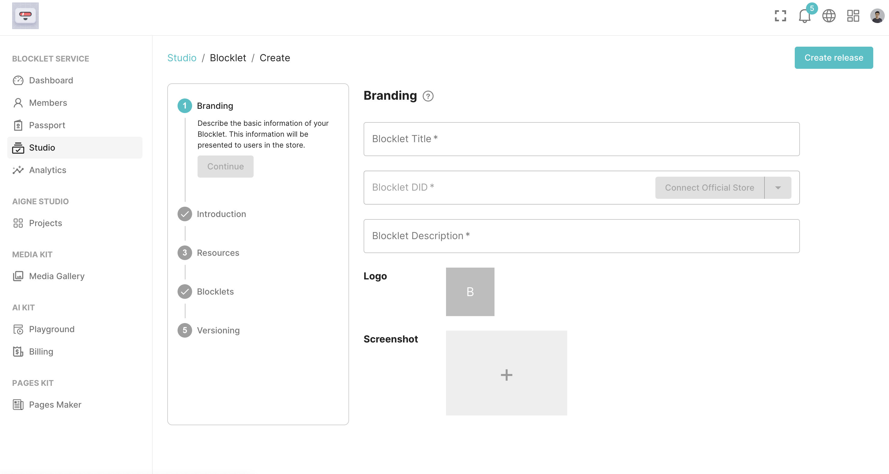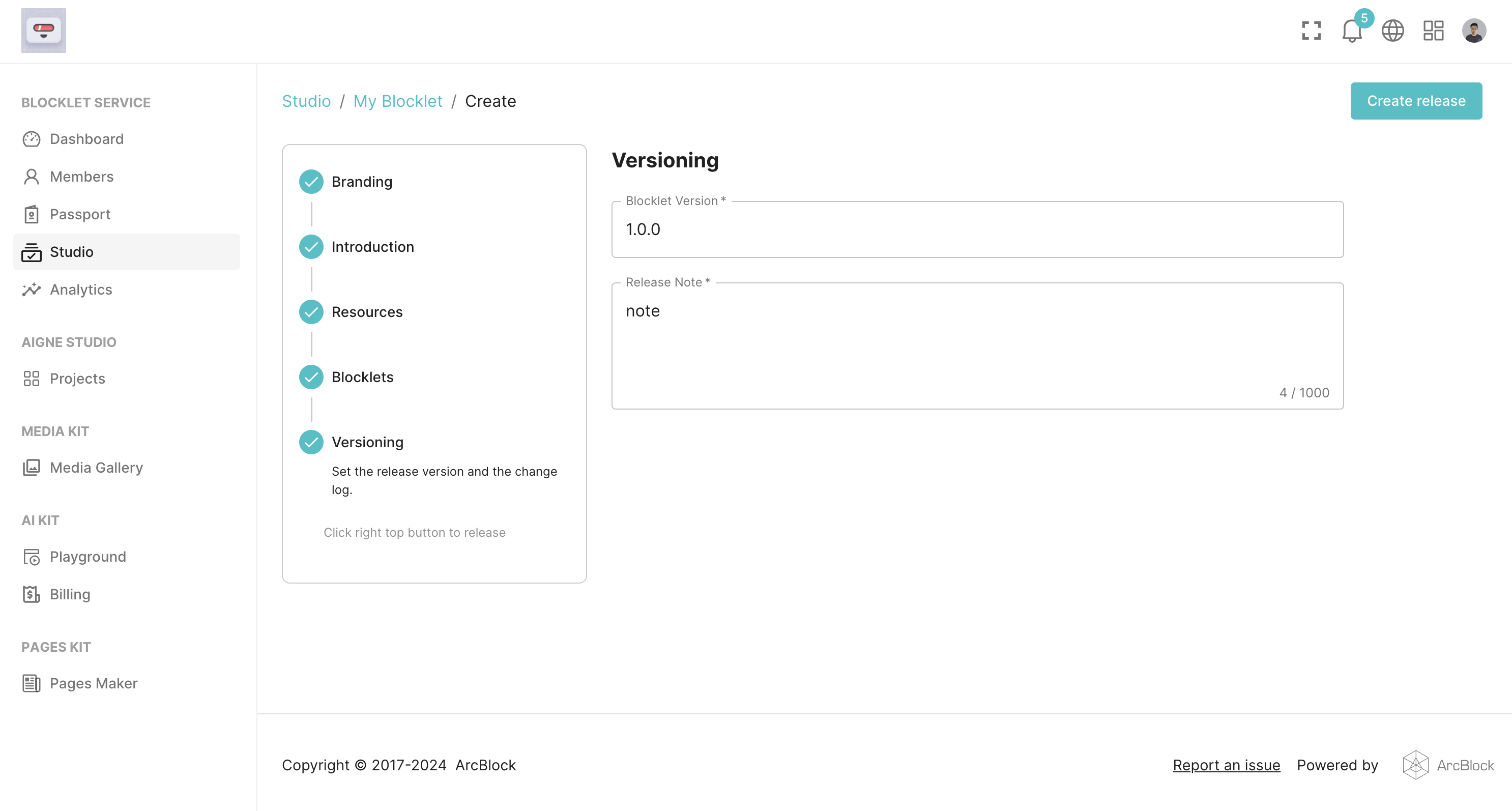 After filling in all the details, click the "Create release" button at the top right to create a new Blocklet: