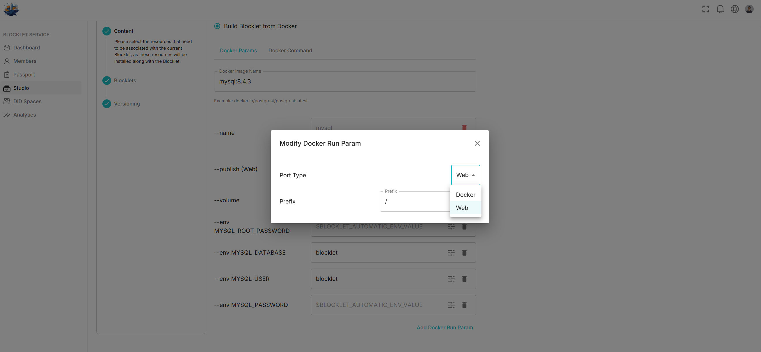 Setting 1: Change the `--publish` option to `docker`. The `--publish` option exposes ports within the Docker container to the host machine. Port conflicts are handled automatically by the Blocklet Server, which reassigns ports as needed. The `--publish(web)` option, conversely, signifies that the Blocklet Server should assign a mount point for access. Since direct access to MySQL isn't required, we change the option to `docker`.