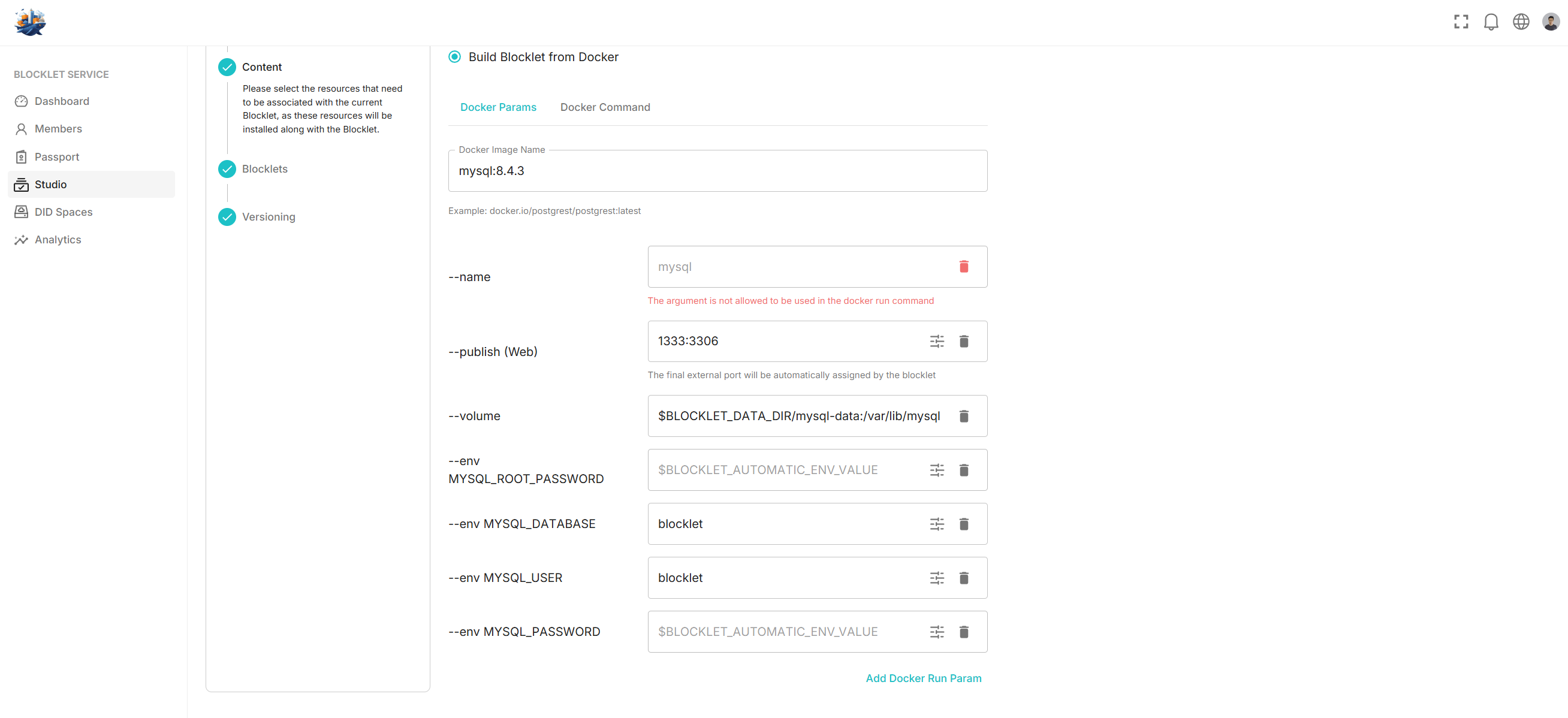 Notice the red error for the `--name` parameter. Blocklet Server automatically manages container names during Docker runtime to ensure network isolation and handle internal requests. Therefore, setting this parameter is not allowed. Similarly, several other Docker parameters are also restricted to prevent potential security risks to the host machine during Blocklet operation. Any disallowed Docker parameters will be flagged with a red warning after parsing.