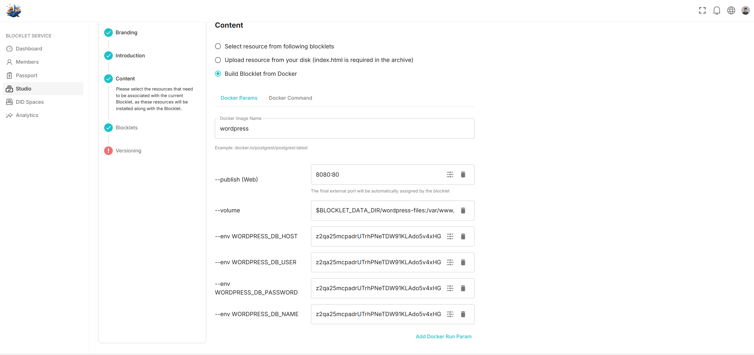 - --publish(web) 8080:80 : We publish port 80 of the WordPress Docker container to the Blocklet Server on port 8080. Because it's a web Blocklet, the Blocklet Server assigns it a mount point.