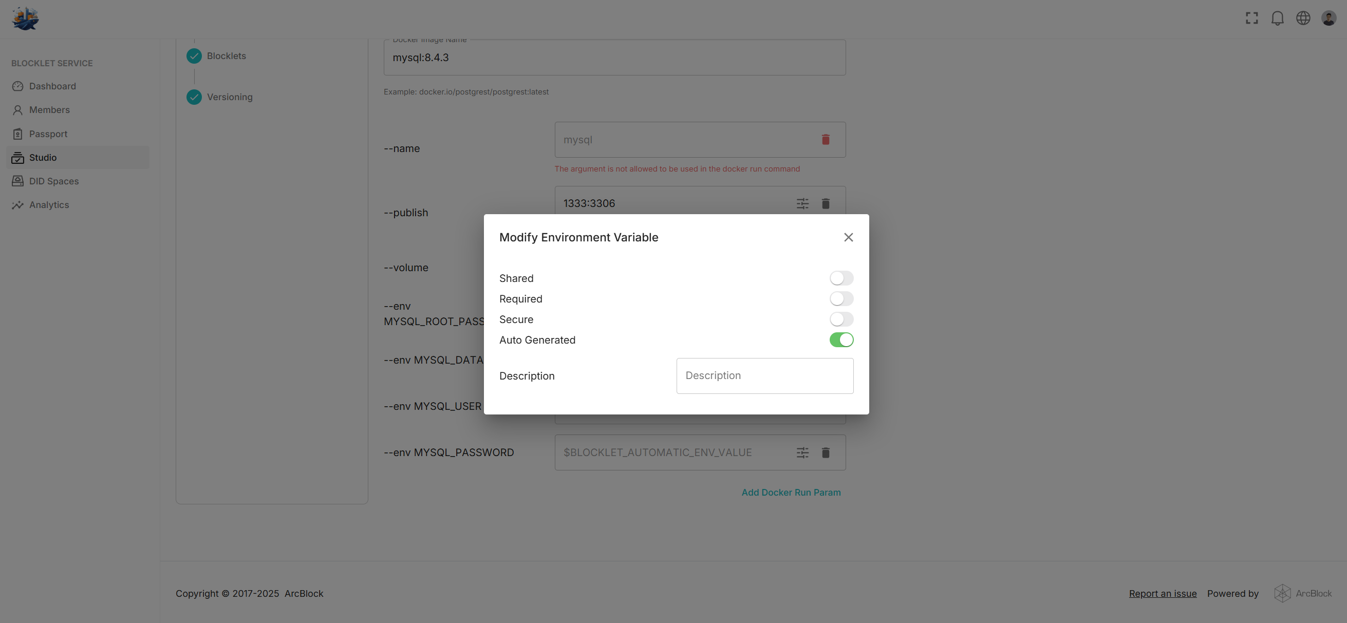 - --env MYSQL_PASSWORD: Setting this password will automatically generate the MySQL database when the Blocklet starts